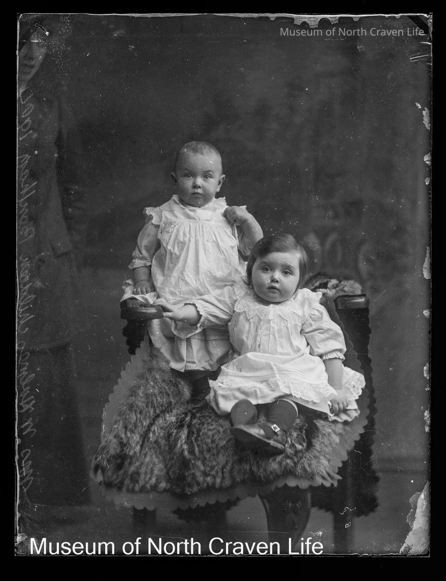 A quarter-plate gelatin silver glass negative. A full length studio portrait of Mrs W. Holmes' two children, Eleanor Marjorie (L) and Clarise Mary (R), Bentham, 1904. They are seated on a draped chairCollection