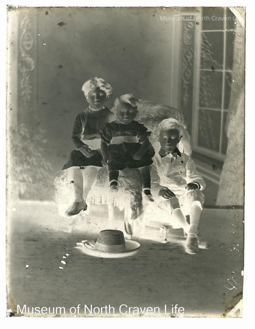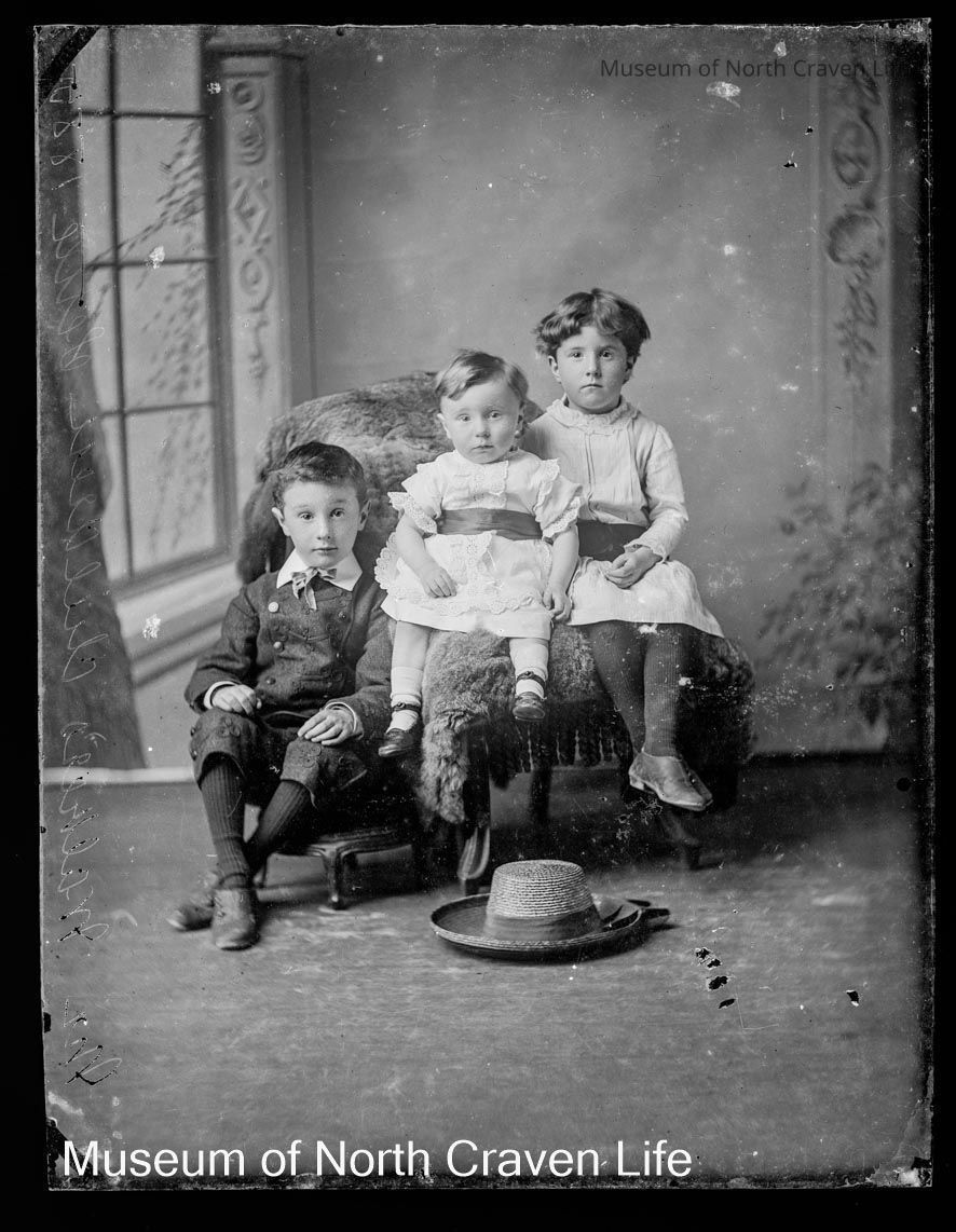 A quarter-plate gelatin silver glass negative. A full length seated studio portrait of three Walker children, Settle, 1875Collection
