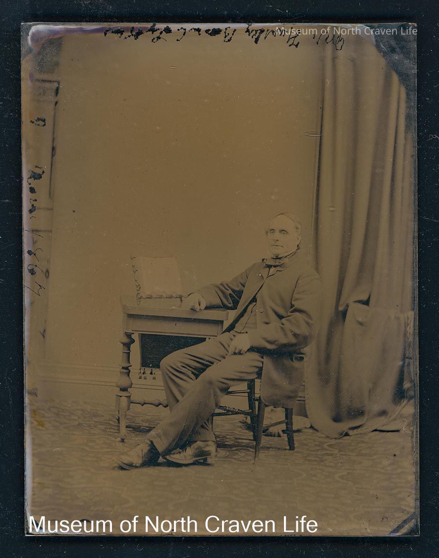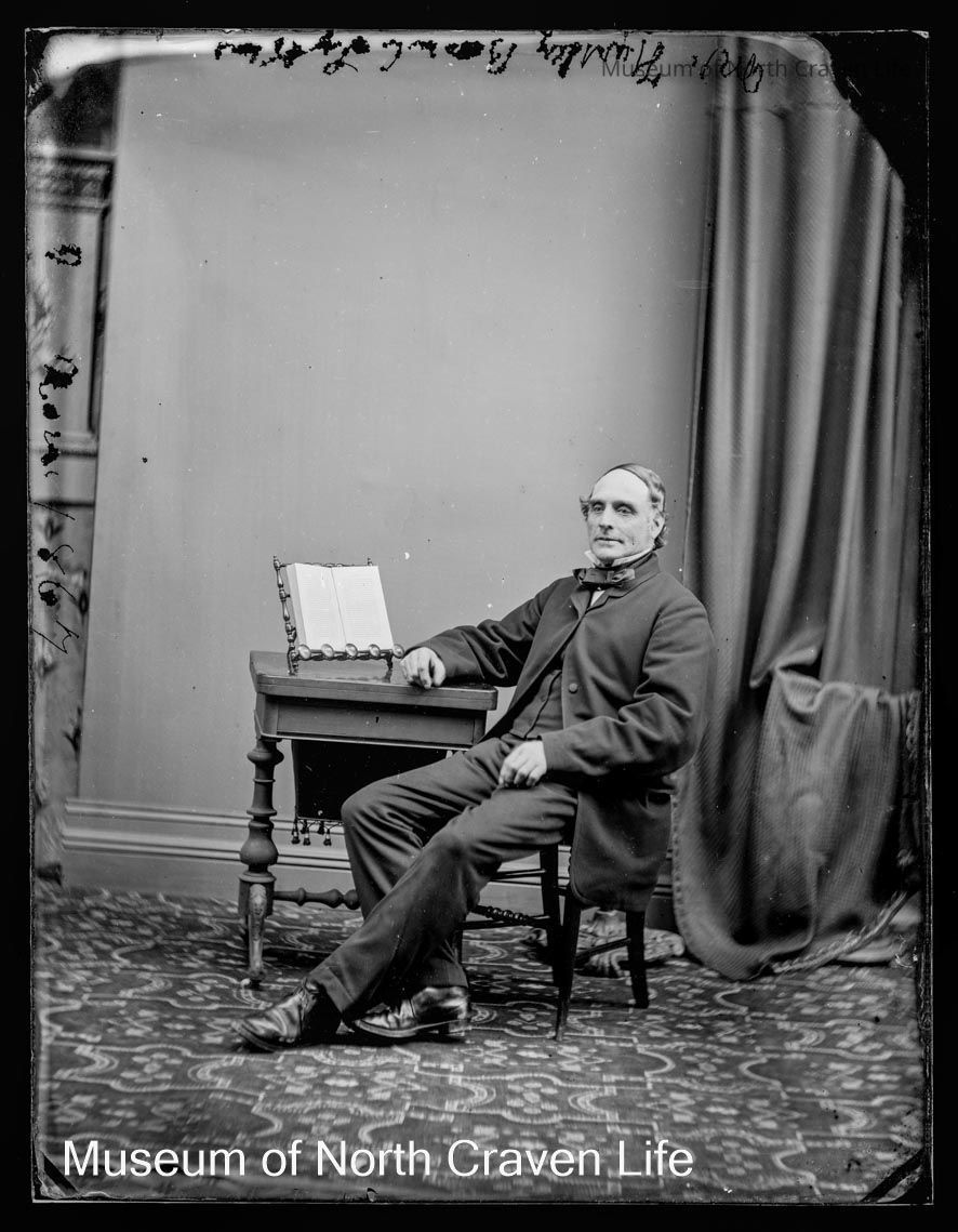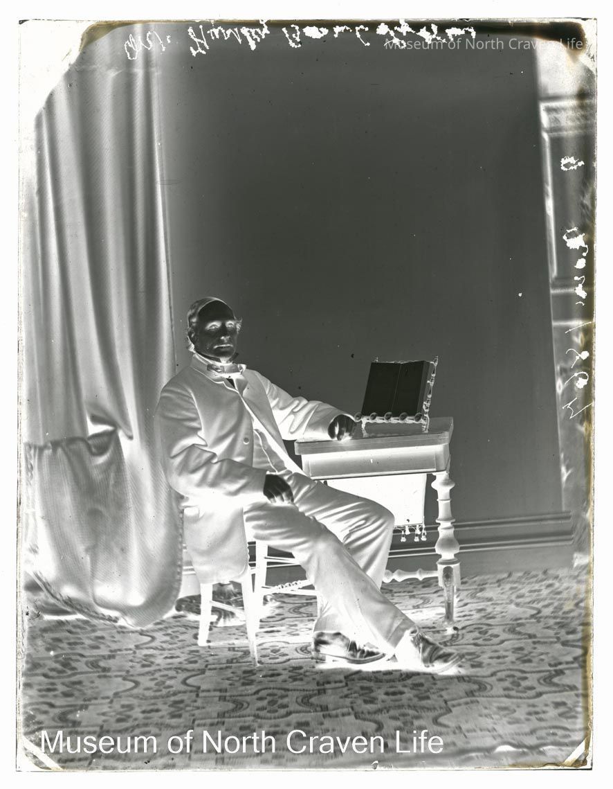 A quarter-plate wet collodion negative. A full length seated studio portrait of Mr Edward Hartley, Barrel Sykes, Settle, Nov. 1867. He is seated at a desk upon which is placed an open bookCollection