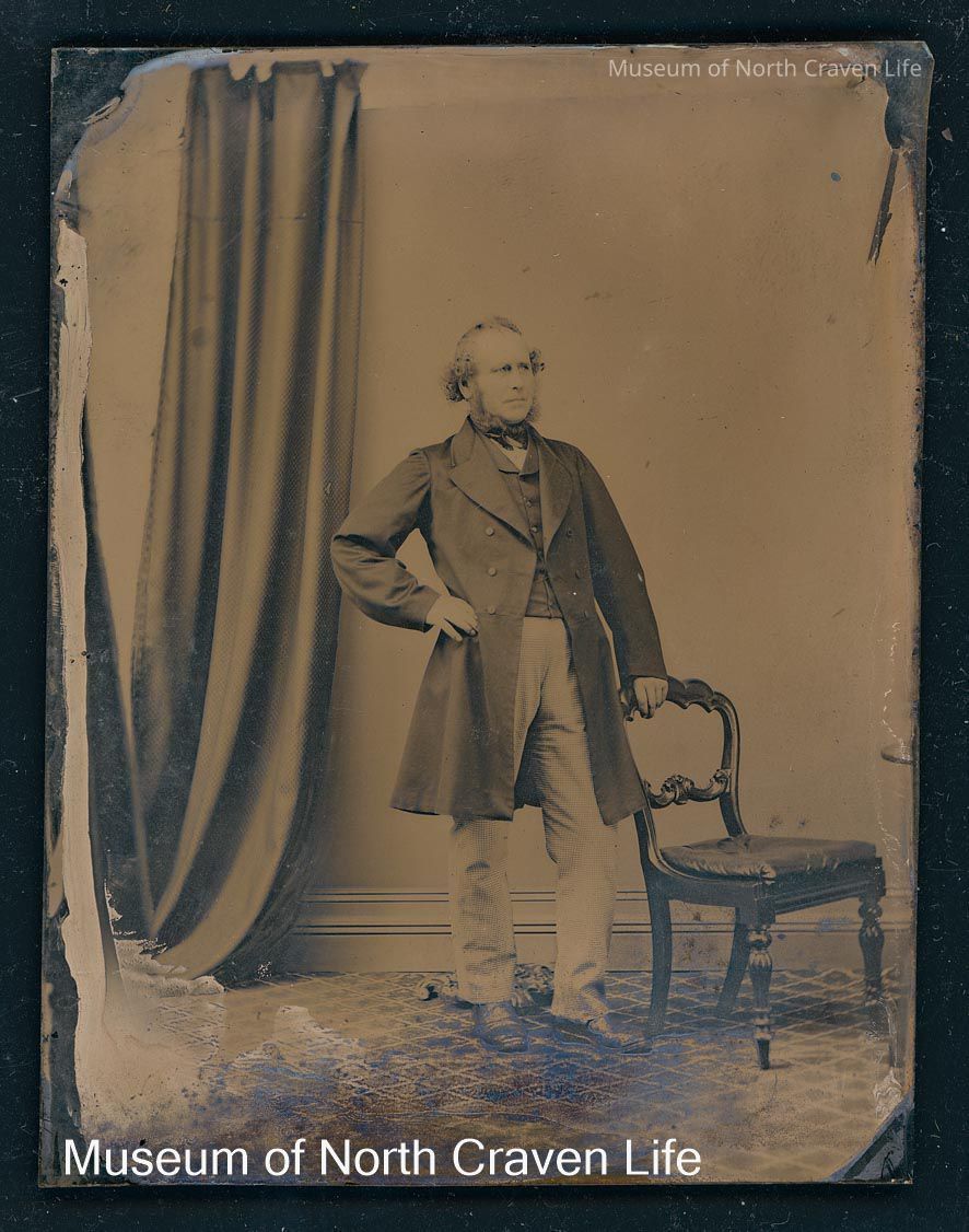 A quarter-plate wet collodion negative. A full length studio portrait of a gentleman standing with one hand resting on the back of a chair, SettleCollection