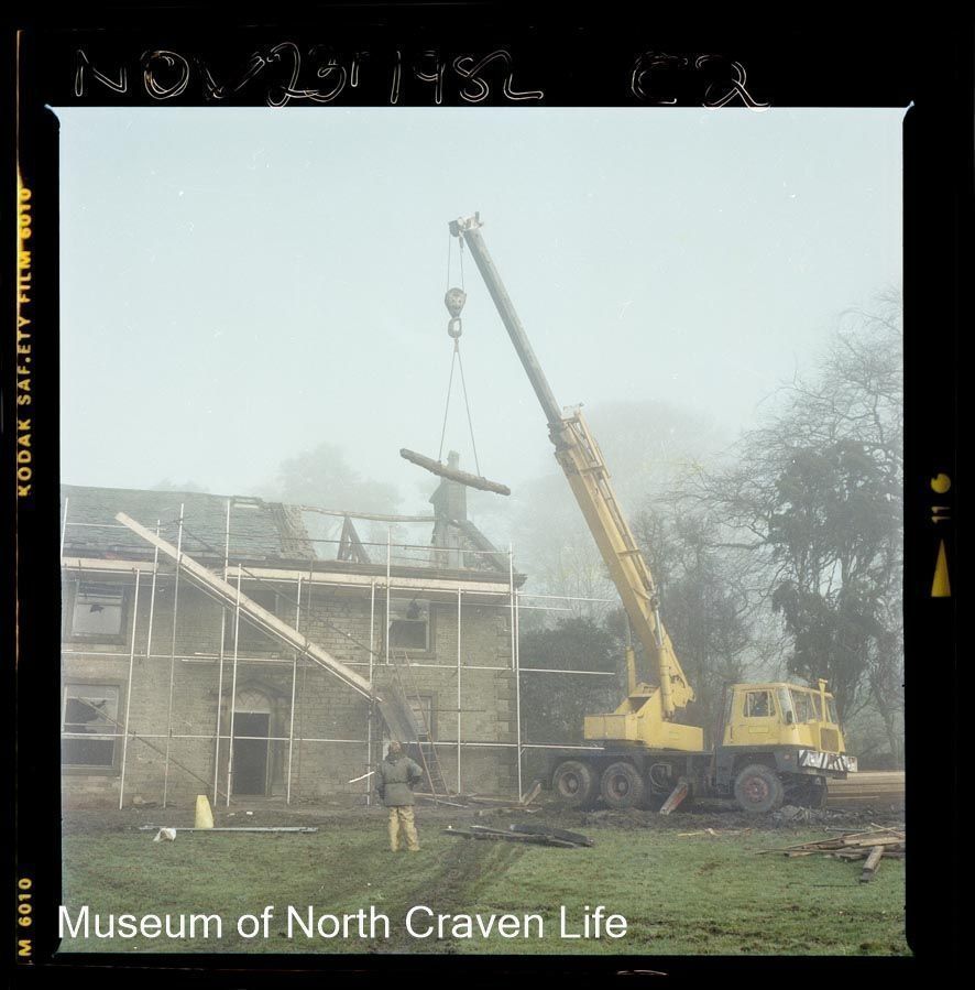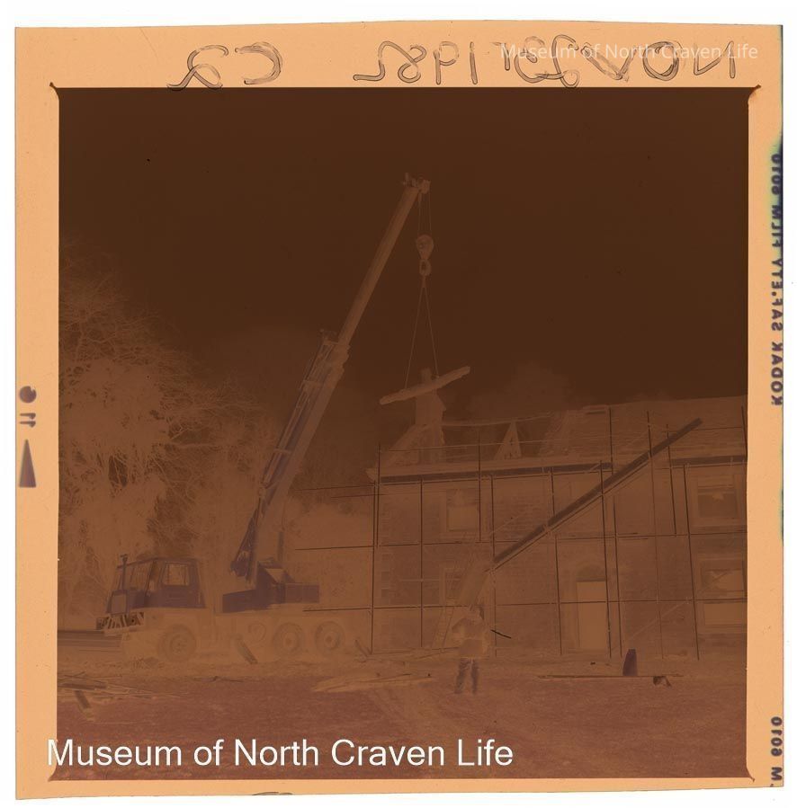 A 2¼" colour film negative. An image of the exterior of Mearbeck, Long Preston. A crane is present and roof repairs are underway. A man stands in the centre groundCollection