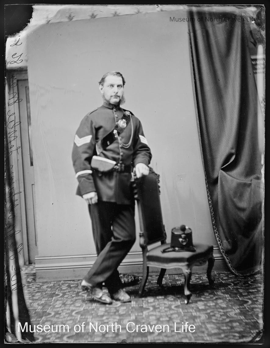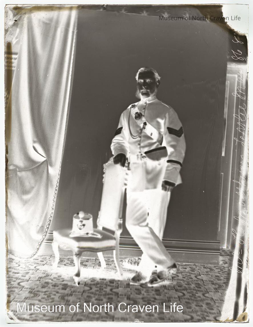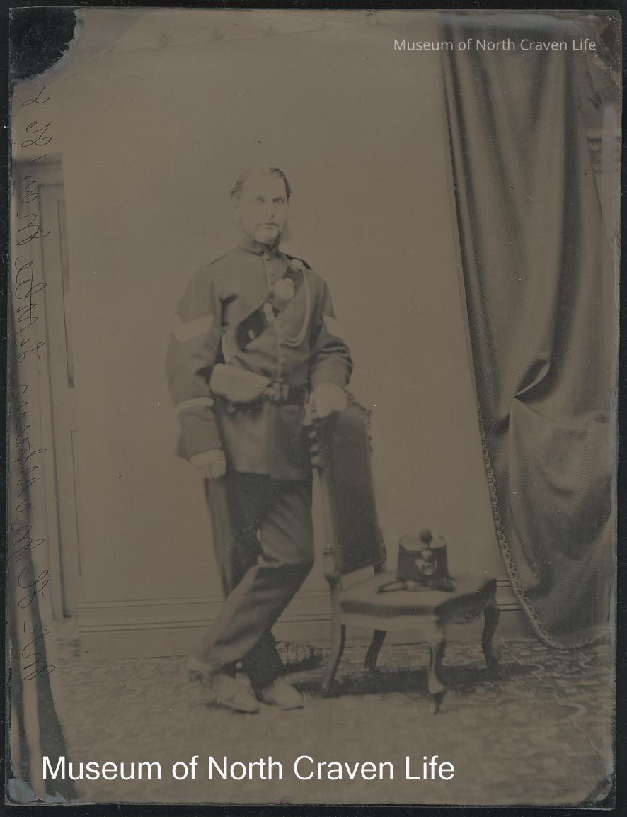 A quarter-plate wet collodion negative. A full length studio portrait of Mr H. Matthews in military uniform, Settle, May 1868. He is standing, leaning on a chair on which his hat is placedCollection