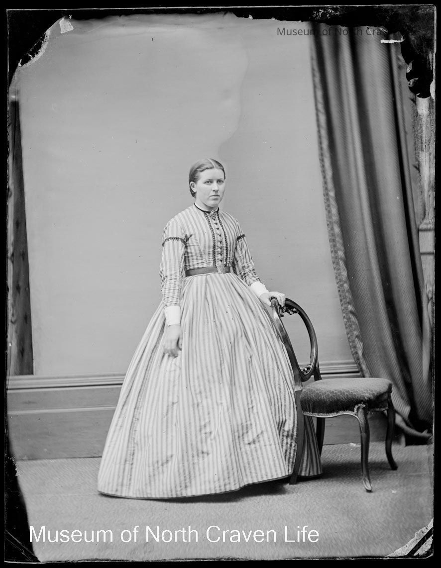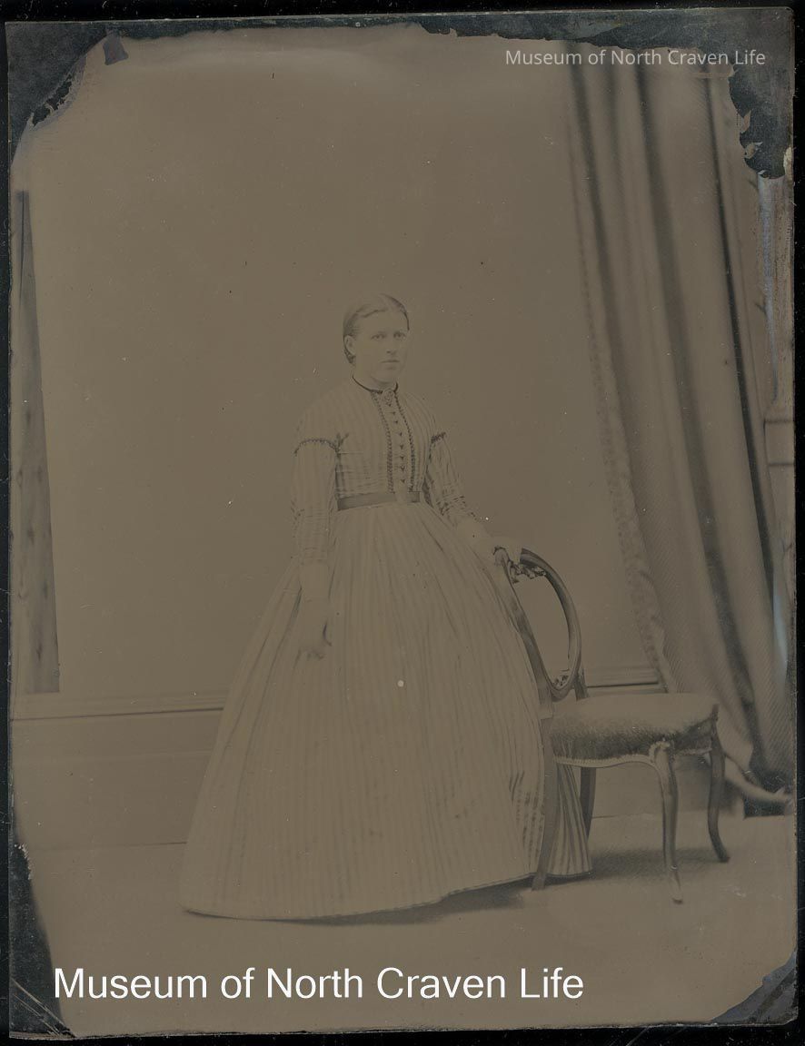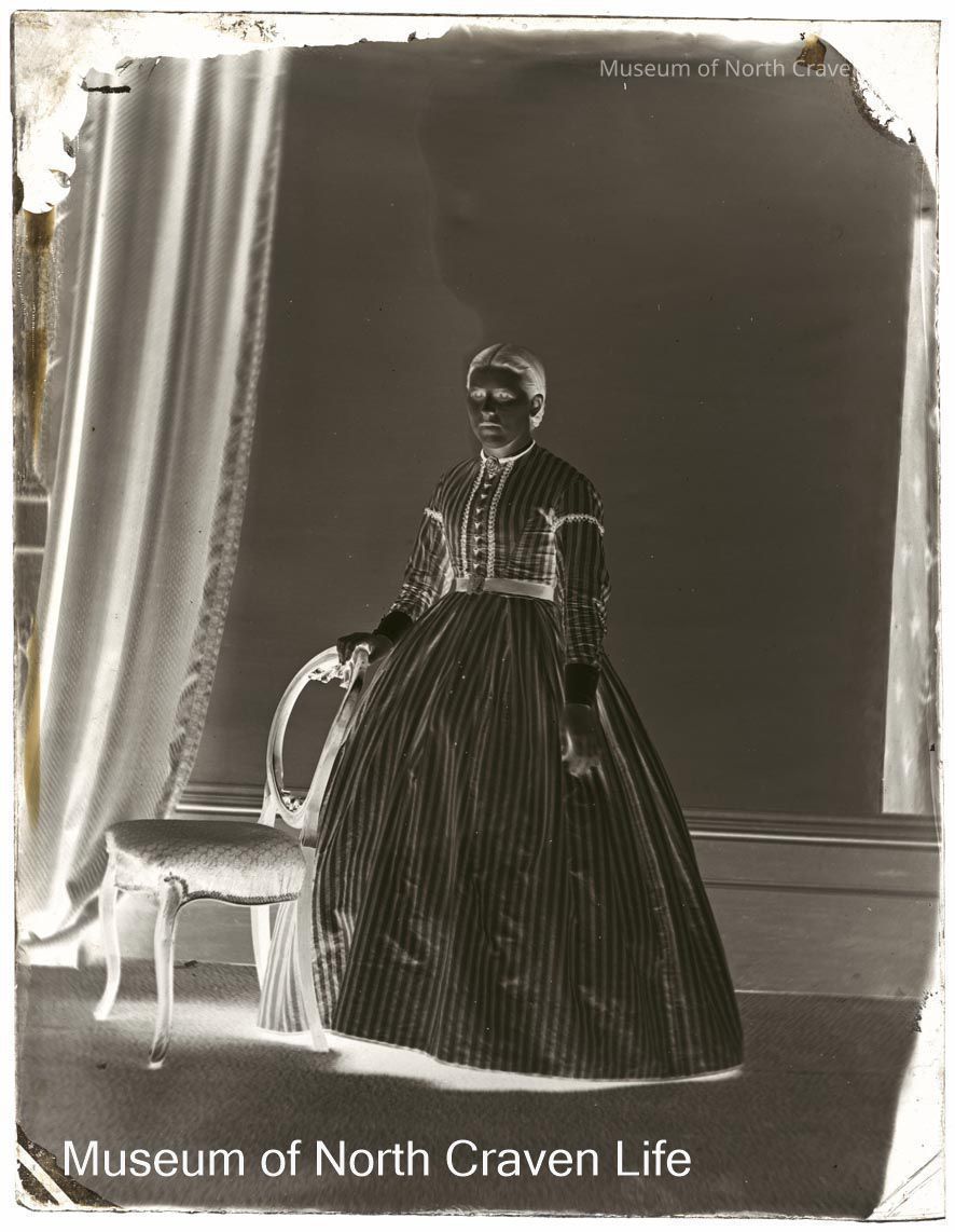 A quarter-plate wet collodion negative. A full length standing studio portrait of Mrs G. Hartley (nee Ellen Hayes), Oct 1866. She is leaning on a chair. Dated October 1866.Collection