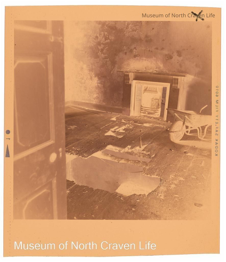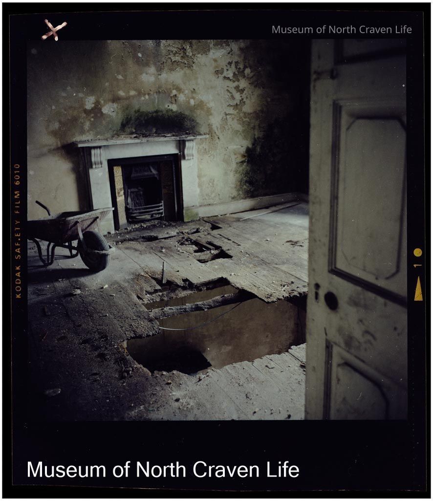 A 2¼" colour film negative. An image of the interior of Mearbeck, Long Preston : fireplace, wheelbarrow, damp walls and large hole in floorCollection