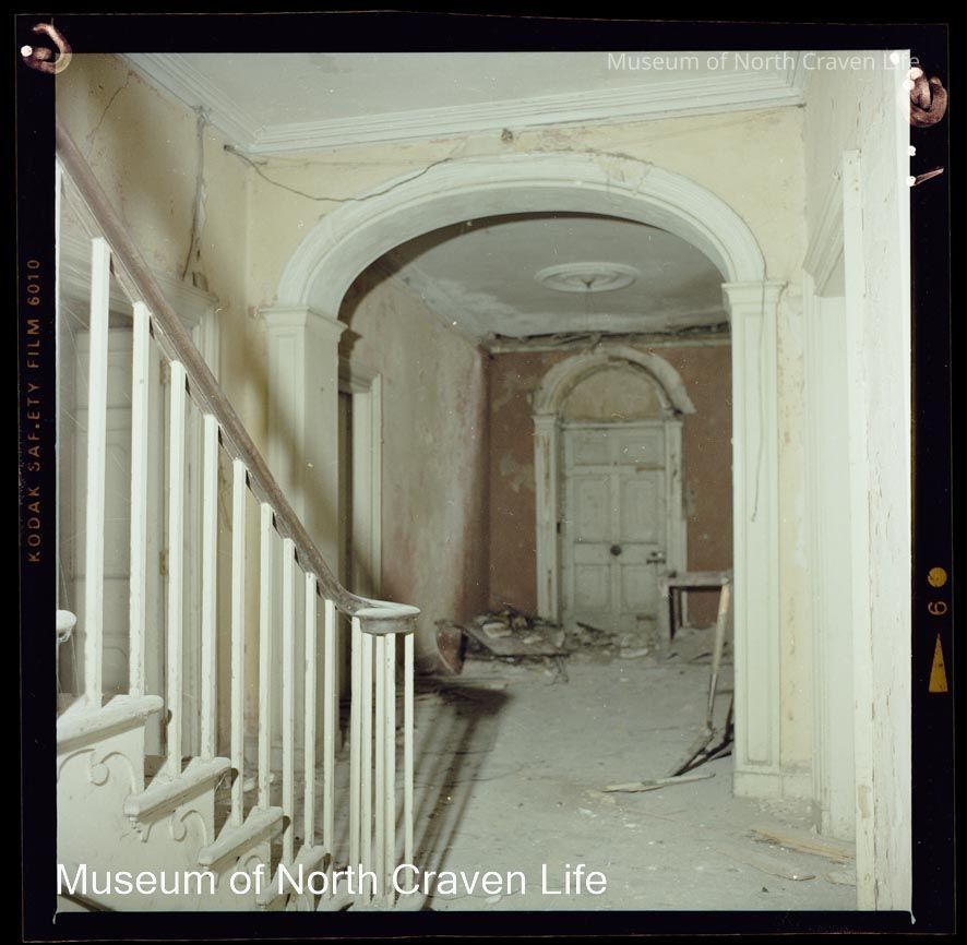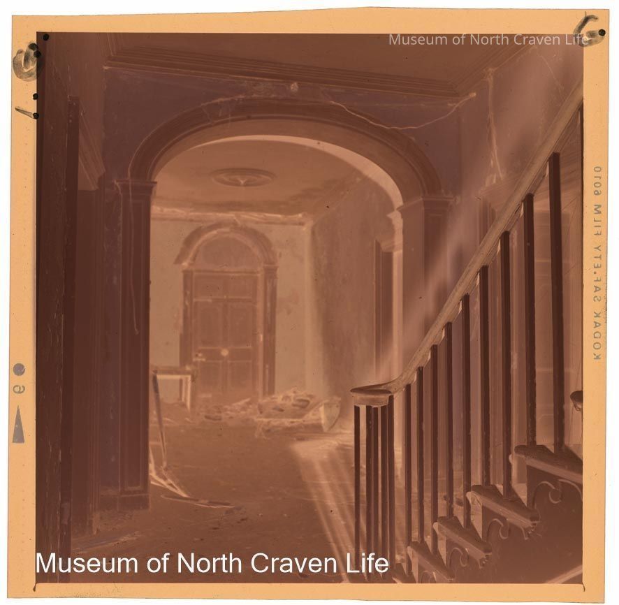 A 2¼" colour film negative. An image of the interior of Mearbeck, Long Preston : staircase with banister, hallway and archwayCollection