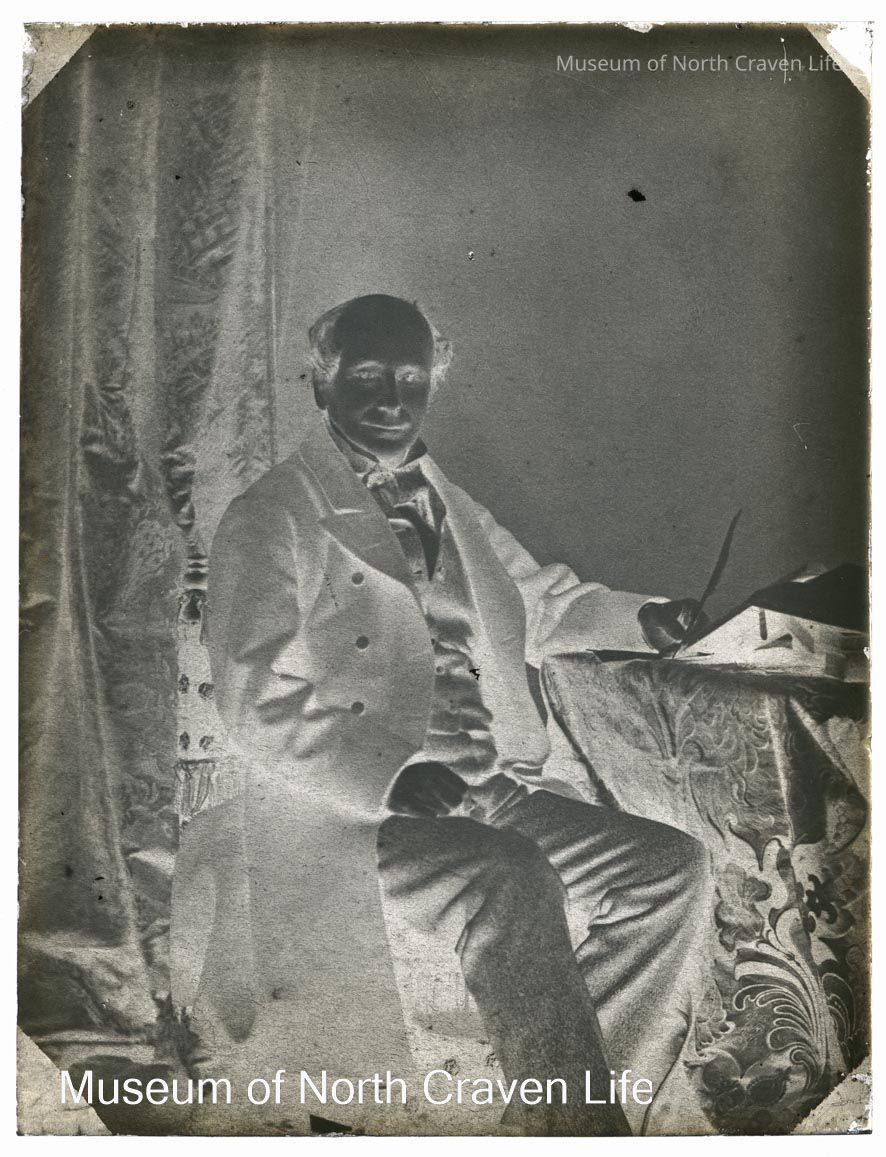 A quarter-plate gelatin silver glass plate negative. A full length seated studio portrait of a man at desk writing with quill pen.Collection