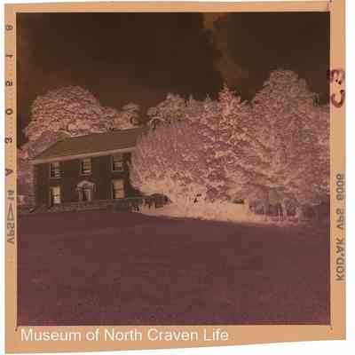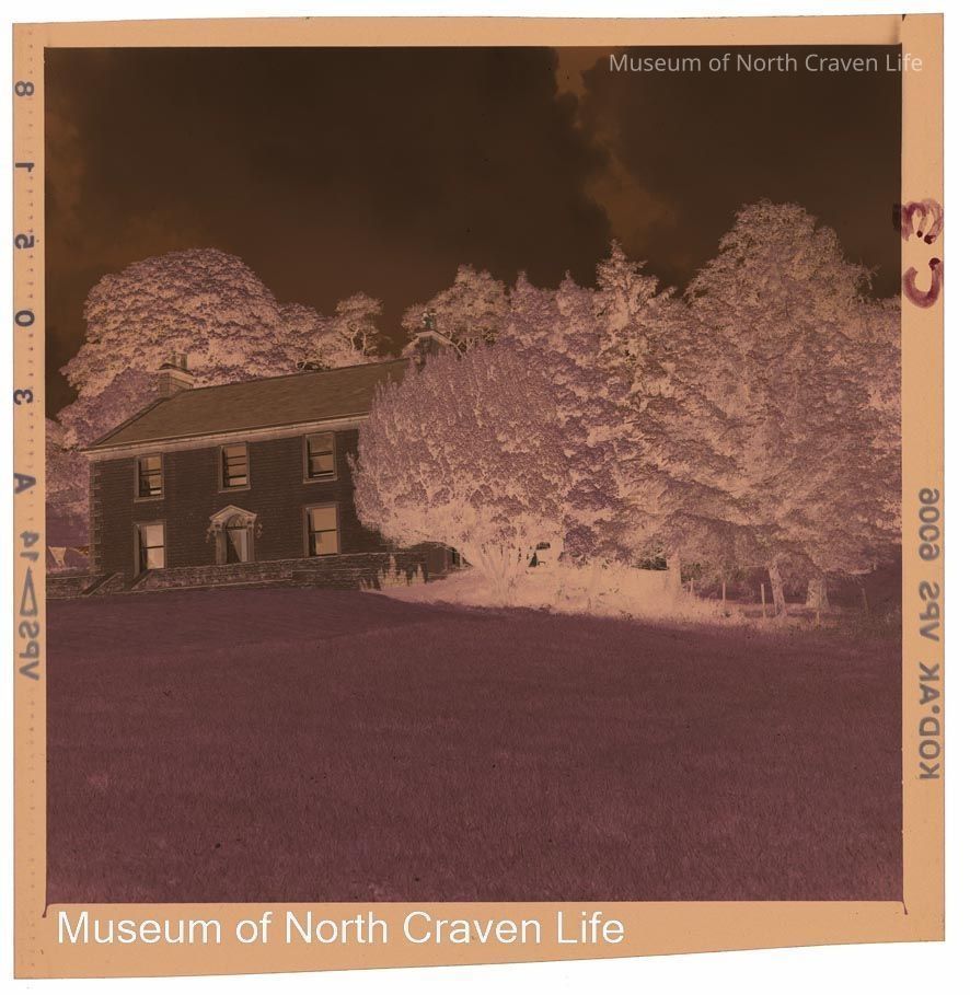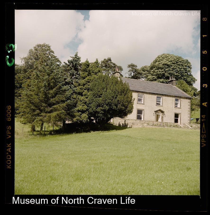 A 2¼" colour film negative. An image of the exterior of Mearbeck, Long Preston viewed across open fields : front elevationCollection