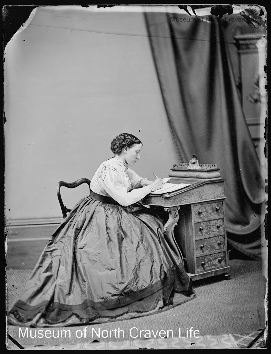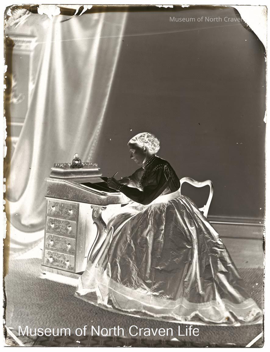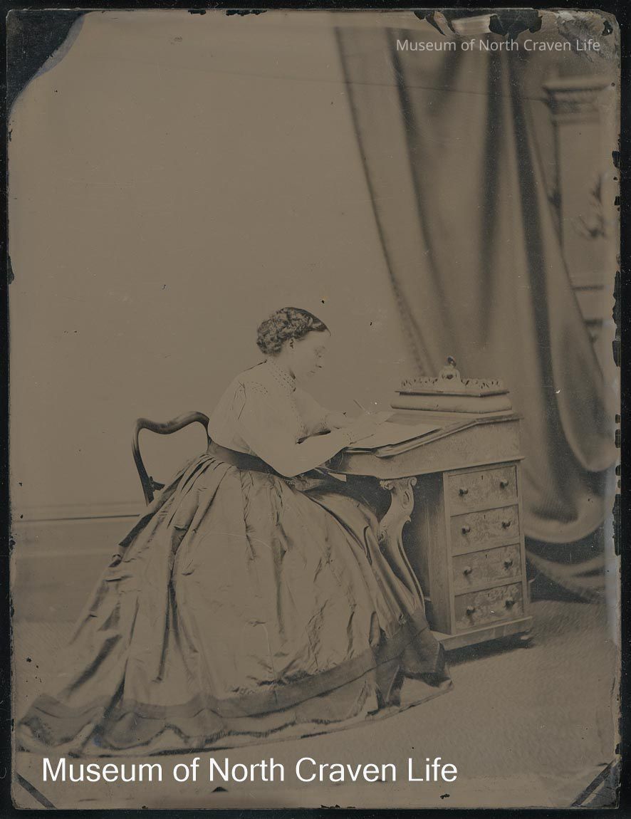 A quarter-plate wet collodion negative. A half length seated studio portrait of Mrs James Hartley, Langcliffe, writing at a desk. Dated August, 1866.Collection