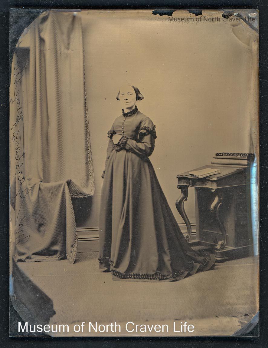 A quarter-plate wet collodion negative. A full length studio portrait of Mrs Garstang, 1867. The subject is standing in front of a writing deskCollection