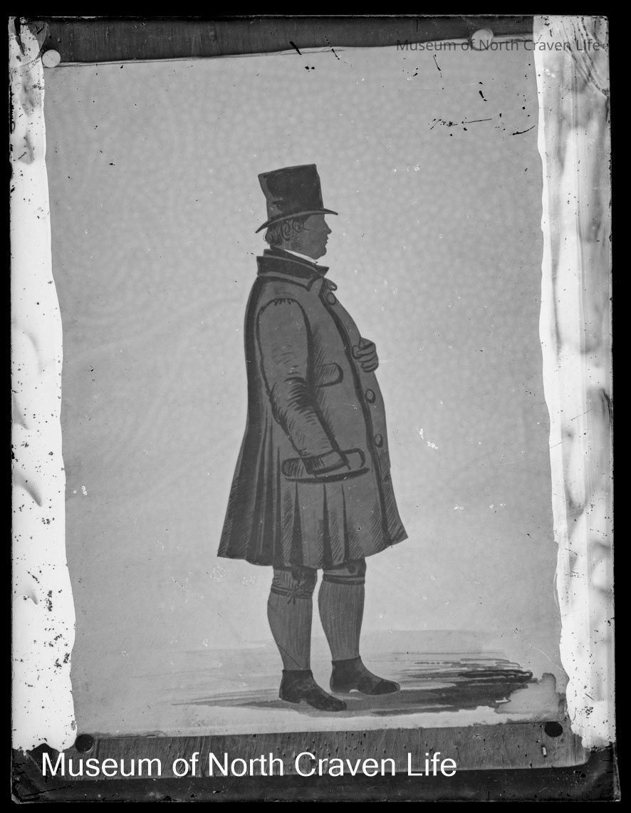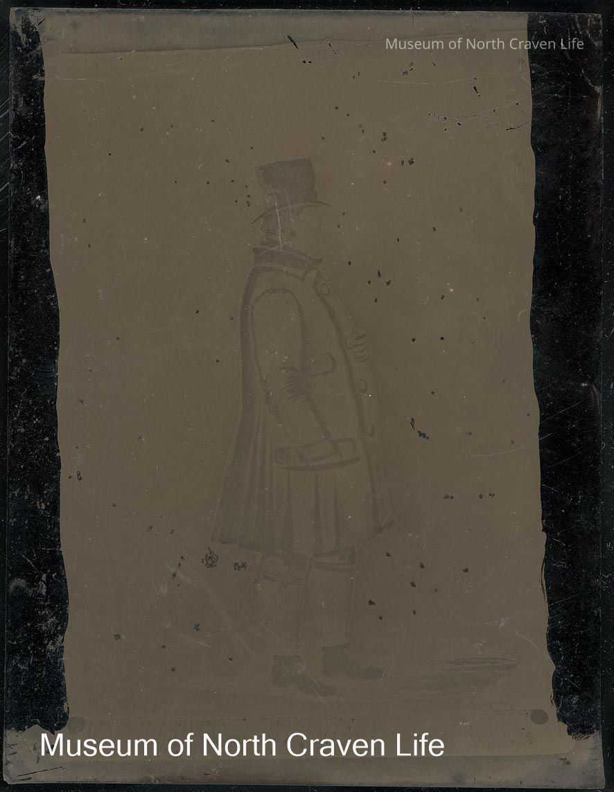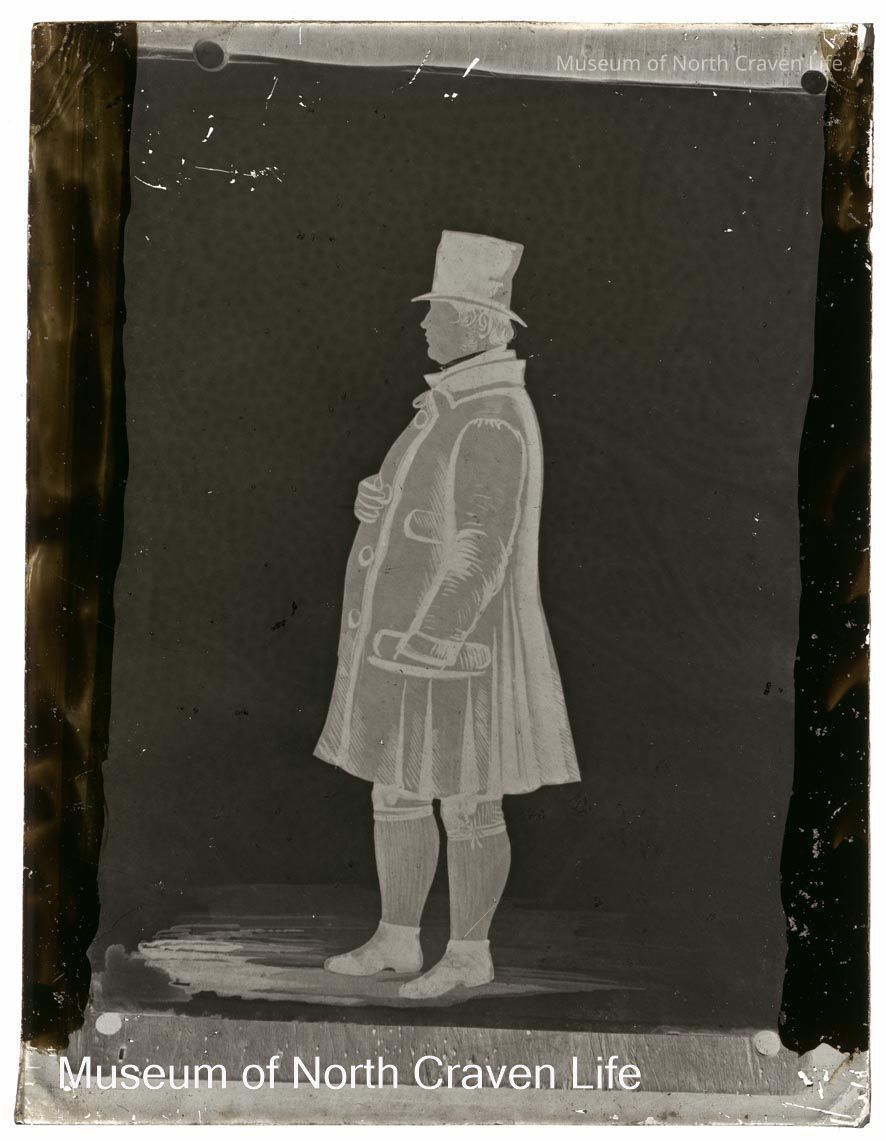 A quarter-plate wet collodion negative. A full length silhoutte drawing of a gentleman wearing a top hat and long coatCollection