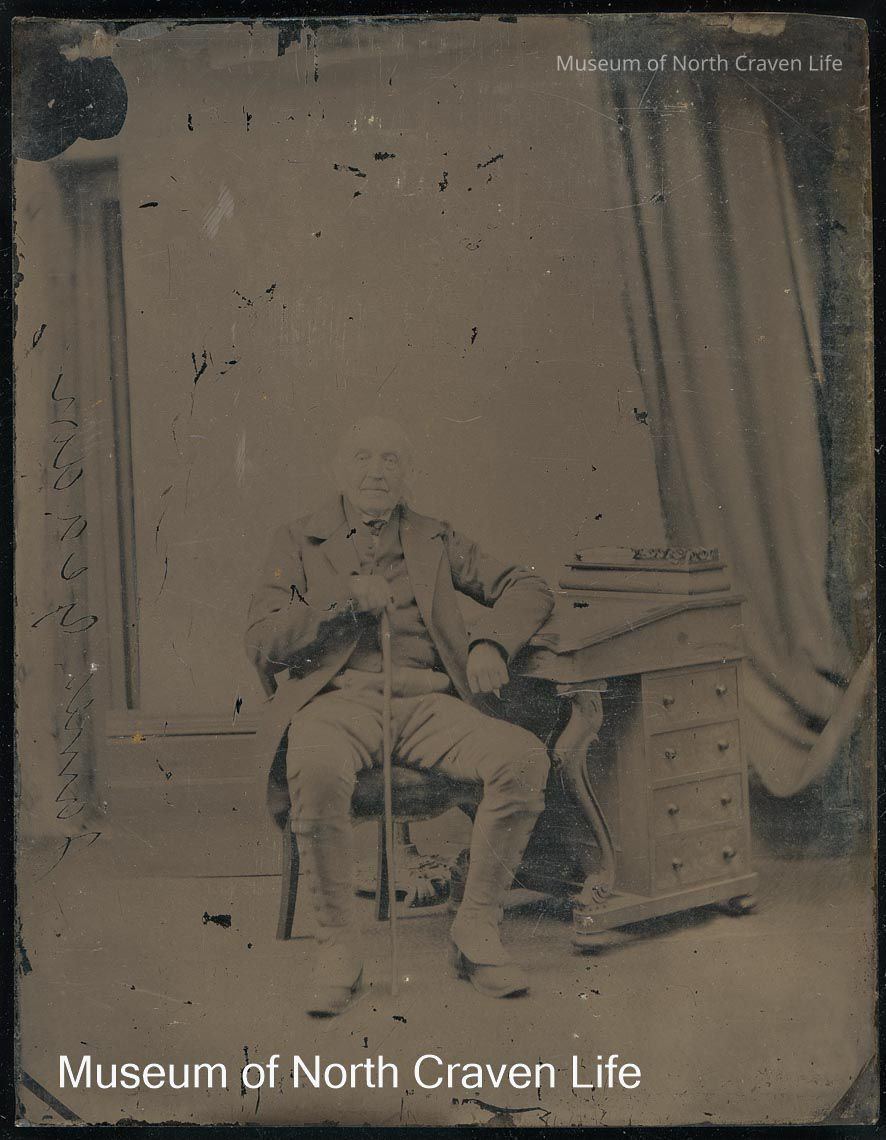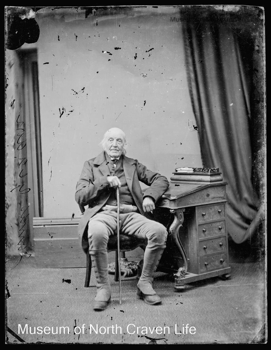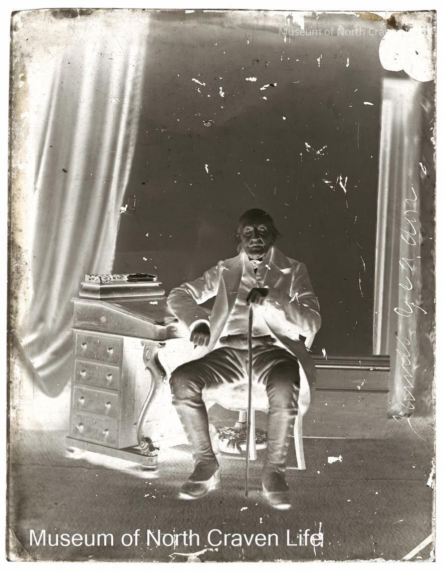 A quarter-plate wet collodion negative. A three-quarter length seated studio portrait of Mr James Yeadon with walking stickCollection