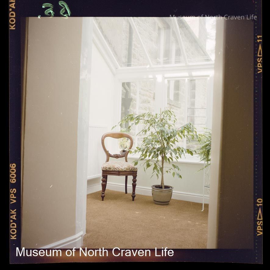 A 2¼" colour film negative. An image of the interior of Mearbeck, Long Preston : skylight, chair and potplantCollection