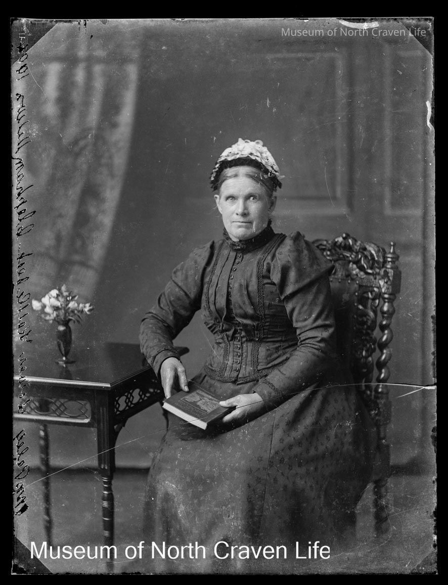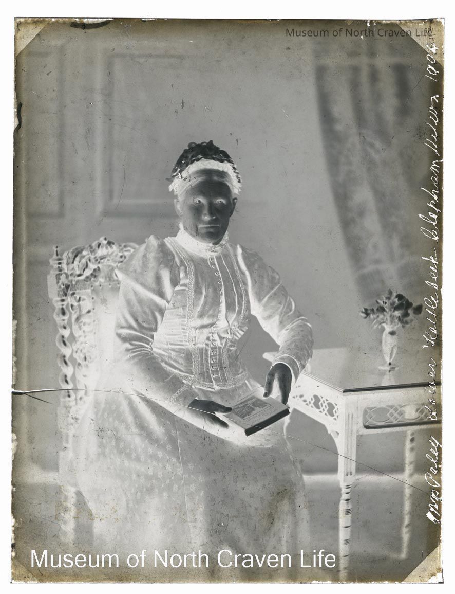 A quarter-plate gelatin silver glass plate negative. A full length seated studio portrait of Miss Paley, Lower Kettlebeck Clapham, 1904.Collection