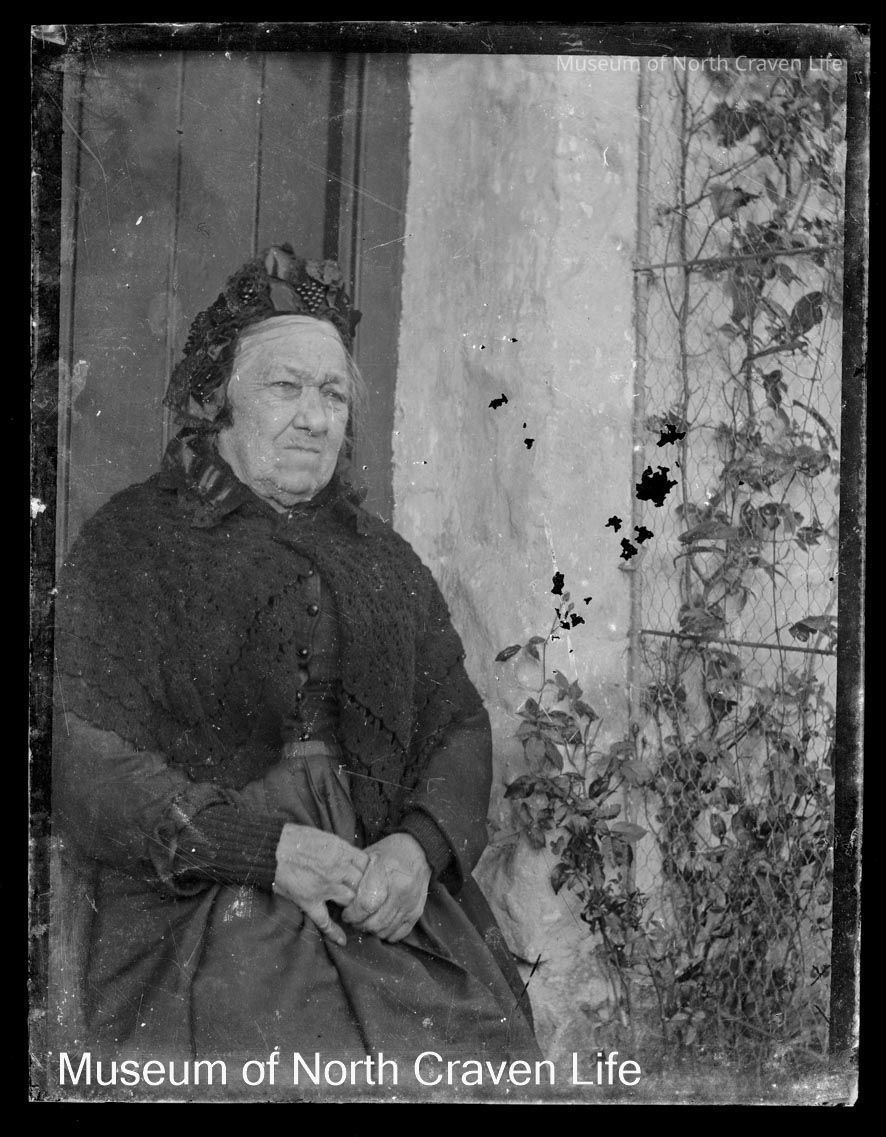 A quarter-plate gelatin silver glass negative. A three-quarter length portrait of an unknown elderly lady standing in a doorway and clasping her hands. She wears a black bonnet and shawlCollection