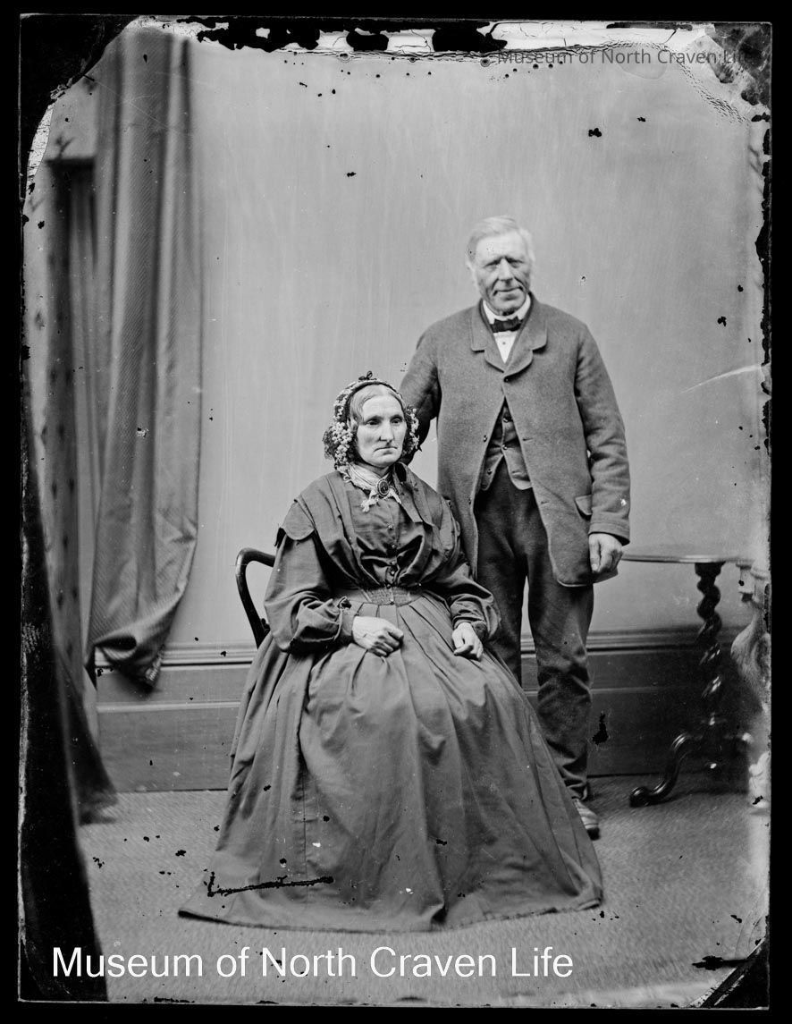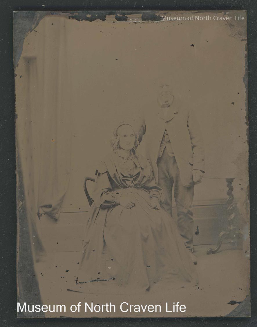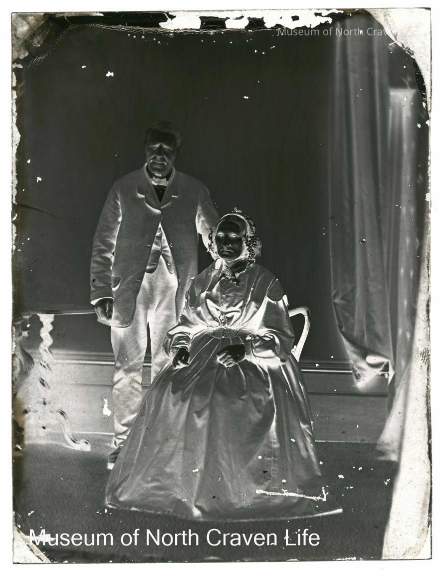 A quarter-plate wet collodion negative. A full length studio portrait of an unknown Lady and Gentleman. She is seated while he stands to her left with a small round table behind himCollection