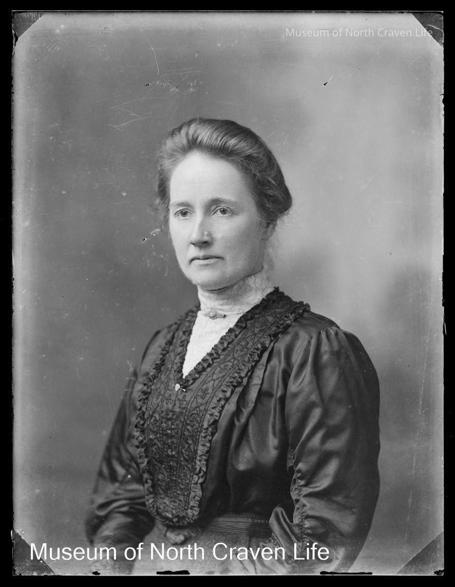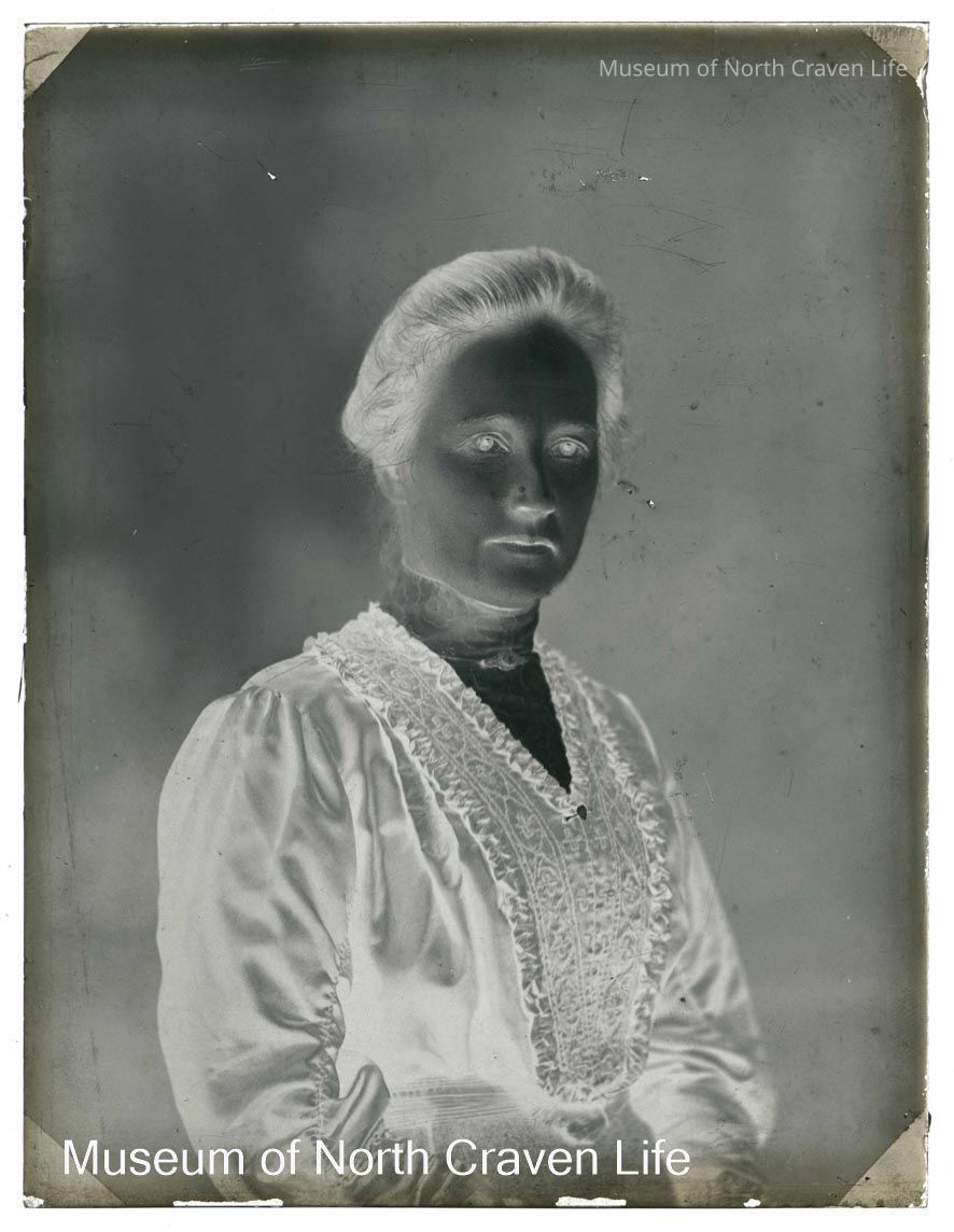 A quarter-plate gelatin silver glass negative. A half length seated studio portrait of Elizabeth Ann Horner (nee Holmes), c.1905. She is dressed in formal attire and wears a pin at the neckCollection