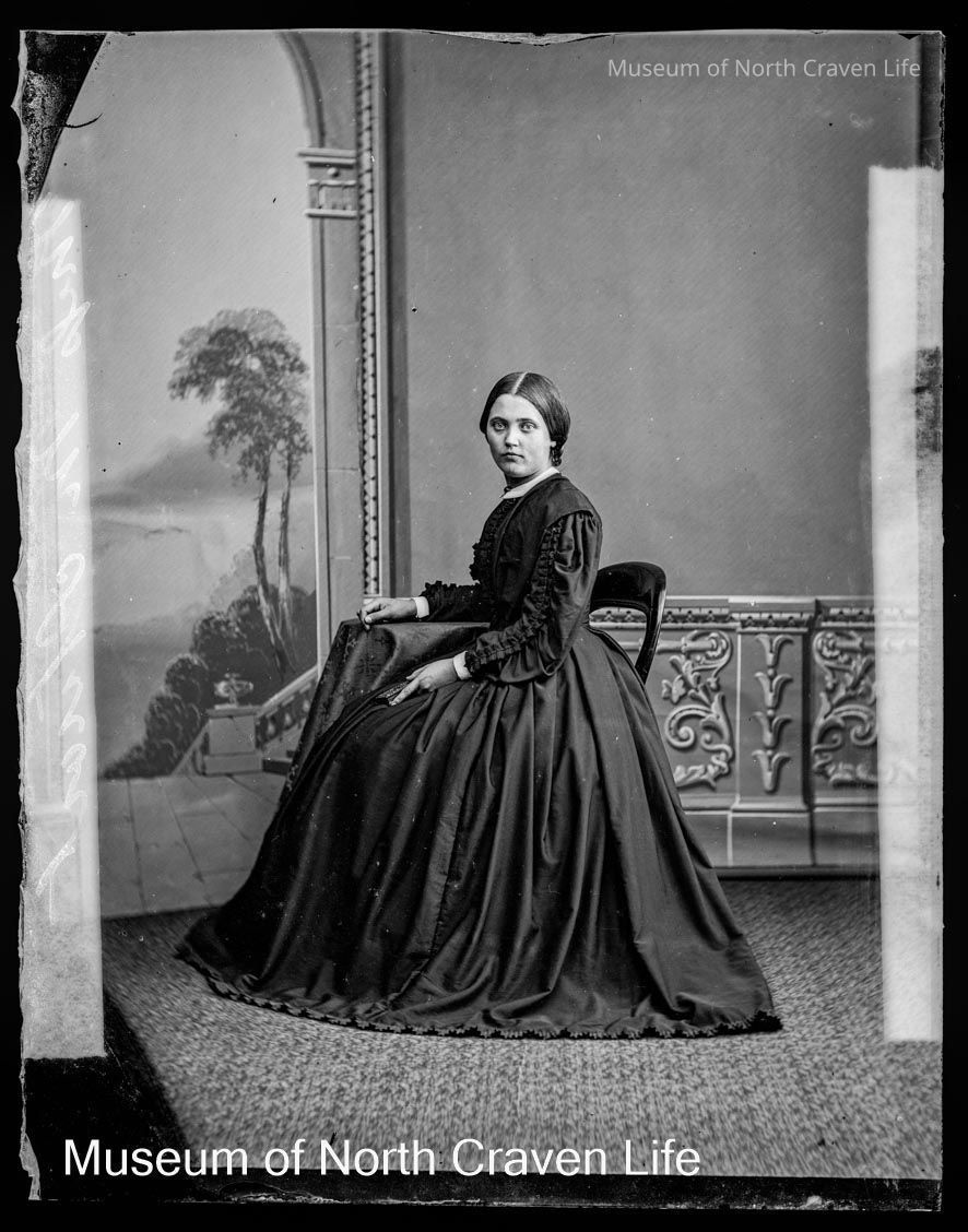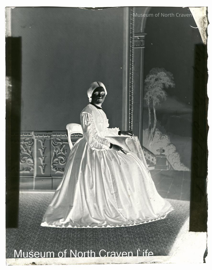 A quarter-plate wet collodion negative. A full length seated studio portrait of Miss M. Stuart, later Mrs Hardy, 1875Collection