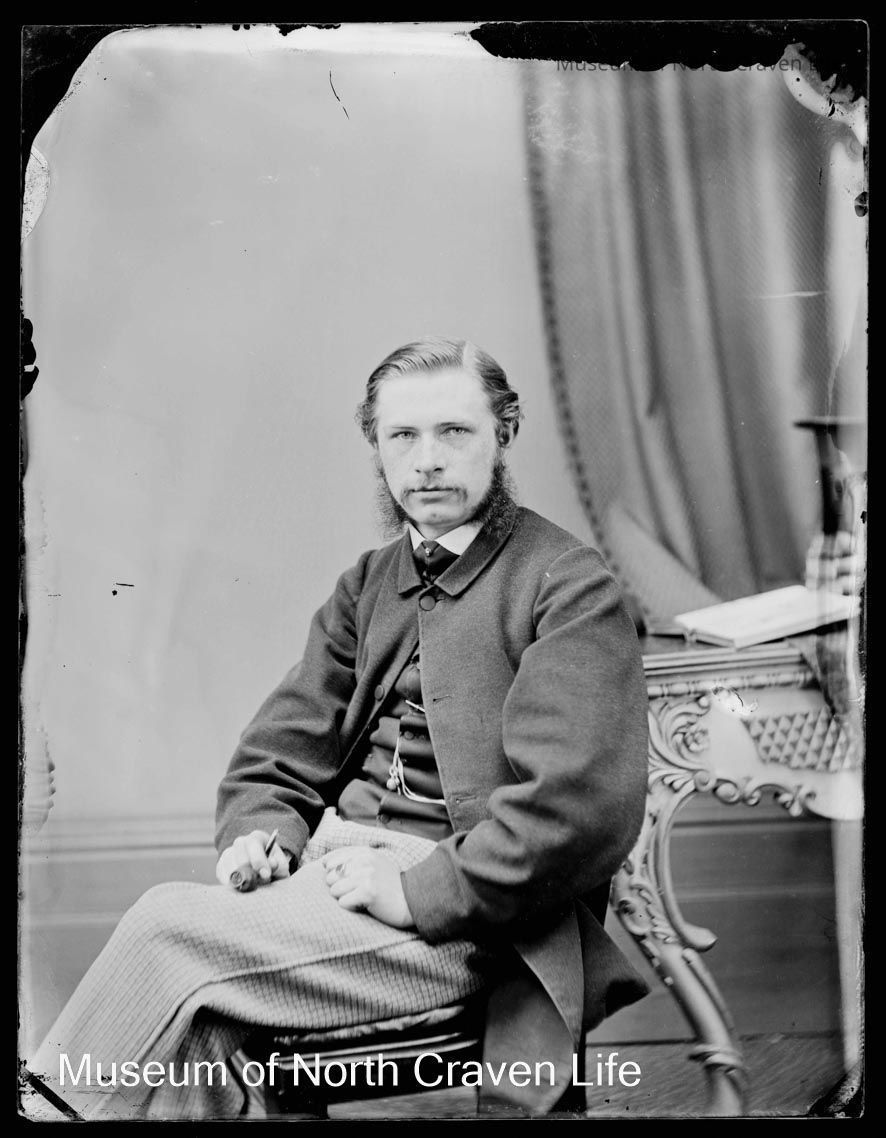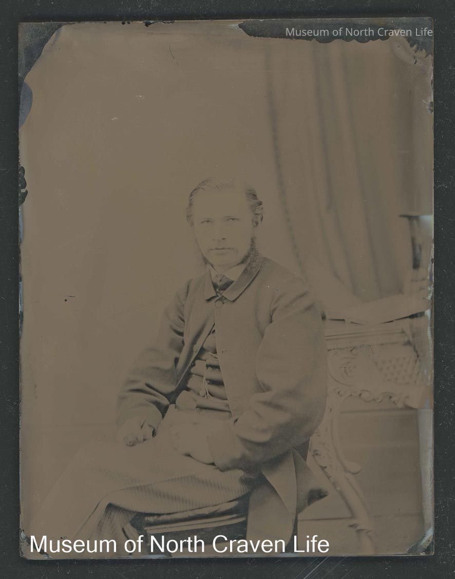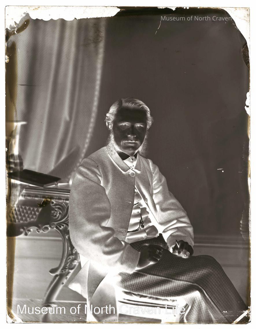 A quarter-plate wet collodion negative. A full length studio portrait of an unknown Gentleman. He is seated in front of a table behind which is a drape. He holds a pipe in his right handCollection