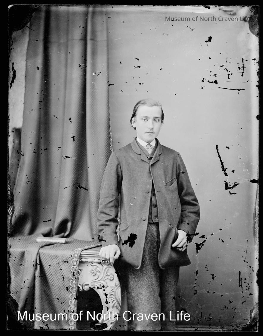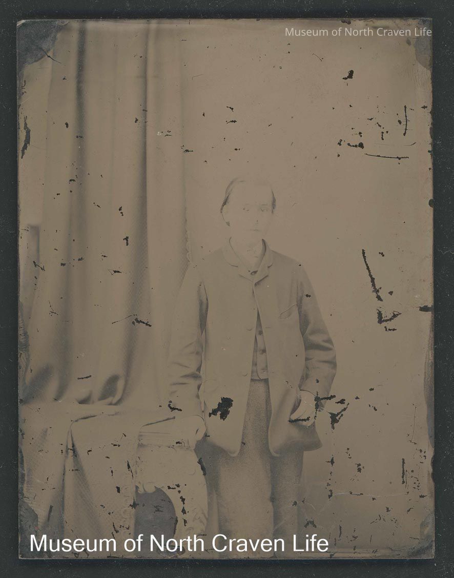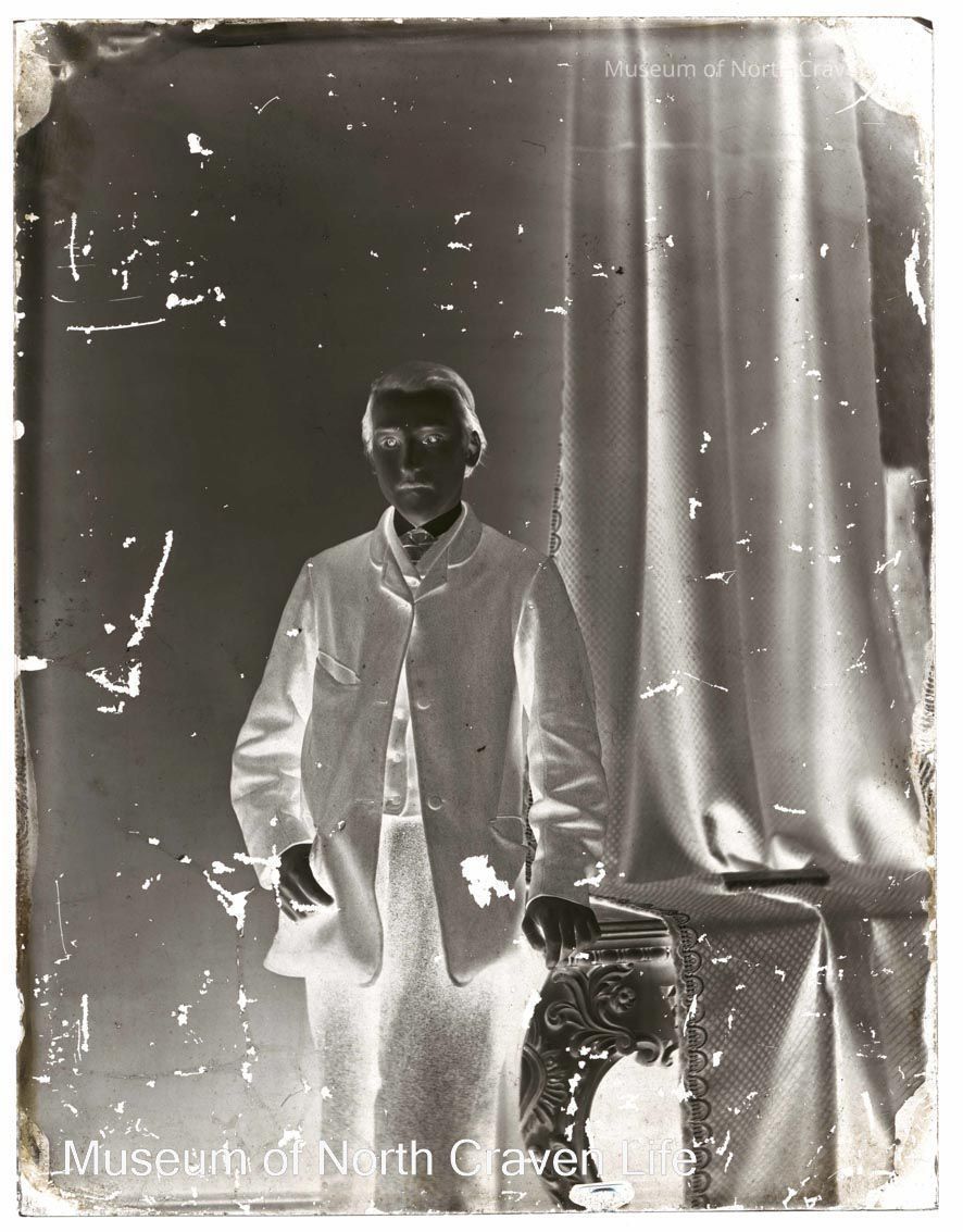 A quarter-plate wet collodion negative. A full length studio portrait of an unknown Gentleman. He is standing in front of a table with one hand resting on the edge. A drape falls down behind him and continues onto the table topCollection