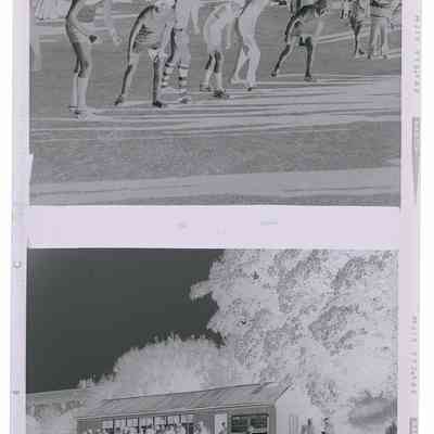 A 2¼" monochrome acetate film negative. A group portrait of young boys racing in front of a pavilion - under 'starter's orders'Collection