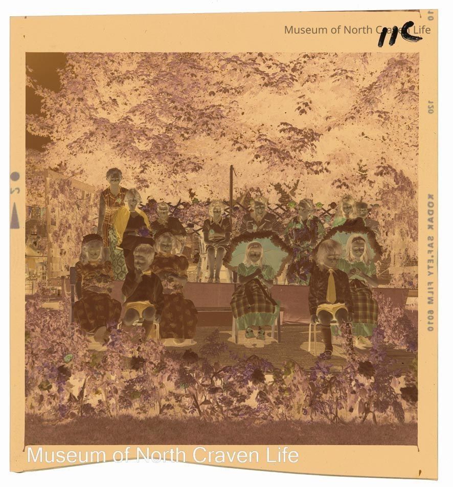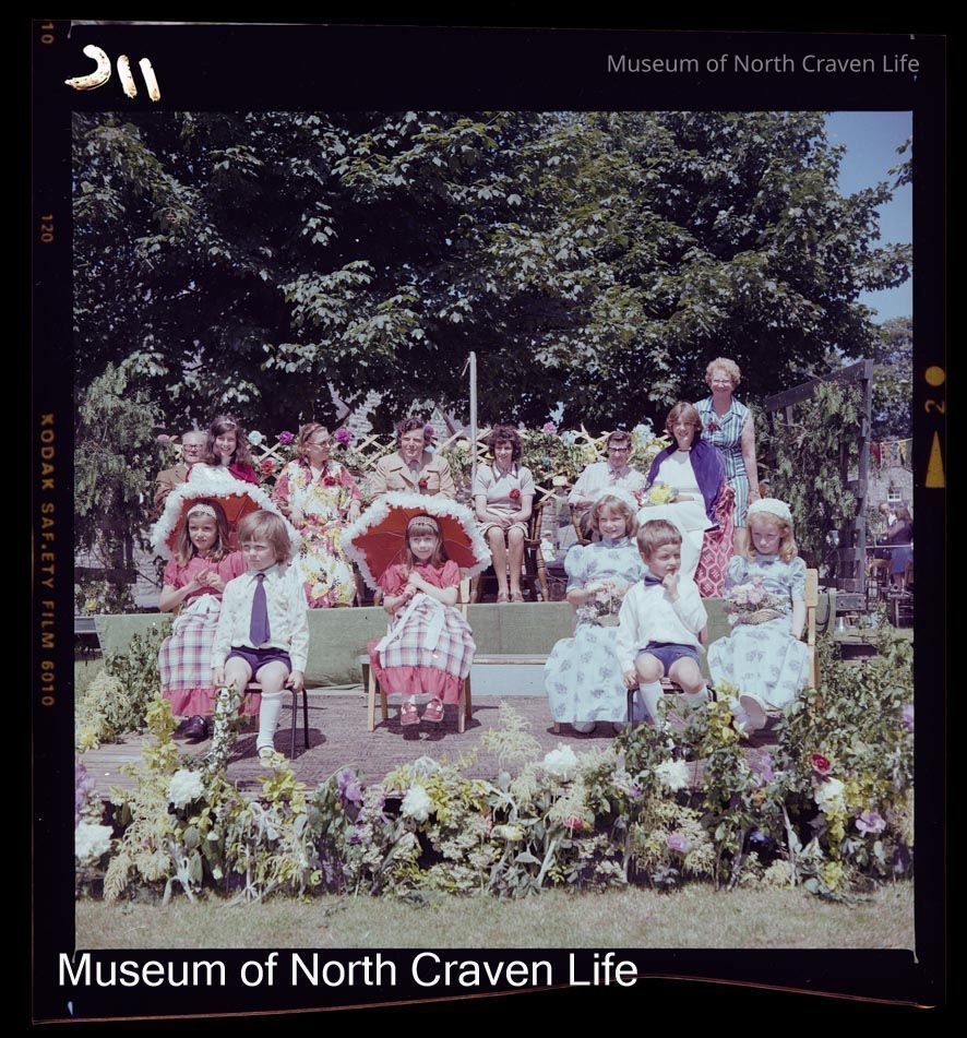 A 2¼" colour film negative. A portrait of a carnival queen seated on a dias surrounded by well-dressed people with young attendants in front of her.Collection