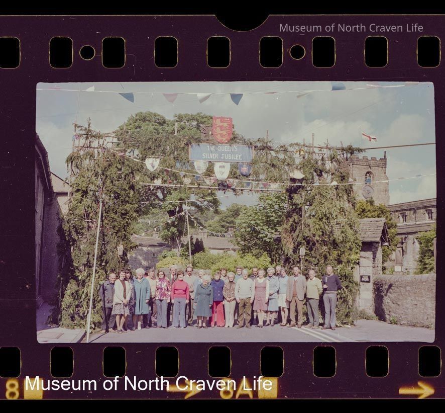 A 35mm colour film negative. A group portrait of people in front of an arch celebrating the Queen's Silver Jubilee outside St Alkelda's Church, Giggleswick. The arch is decorated with greeneryCollection