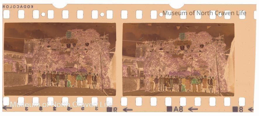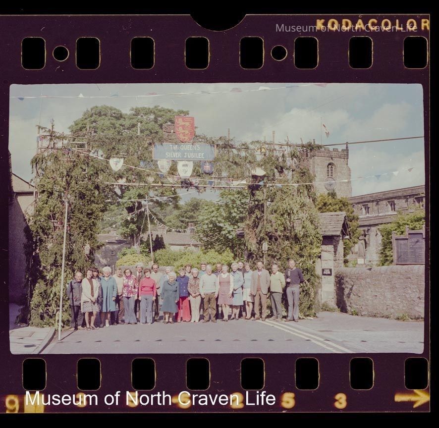 A 35mm colour film negative. A group portrait of people in front of an arch celebrating the Queen's Silver Jubilee outside St Alkelda's Church, Giggleswick. The arch is decorated with greenery.Collection