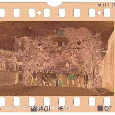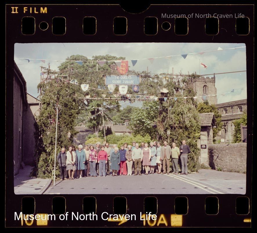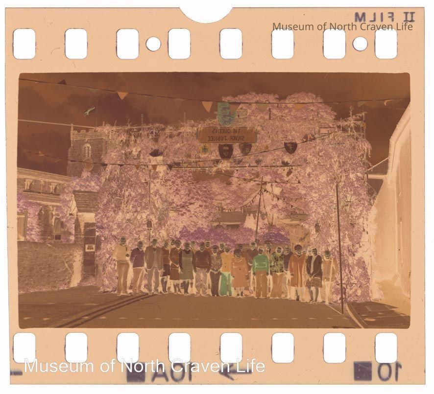 A 35mm colour film negative. A group portrait of people in front of an arch celebrating the Queen's Silver Jubilee outside St Alkelda's Church, Giggleswick. The arch is decorated with greeneryCollection