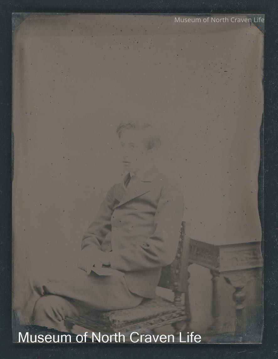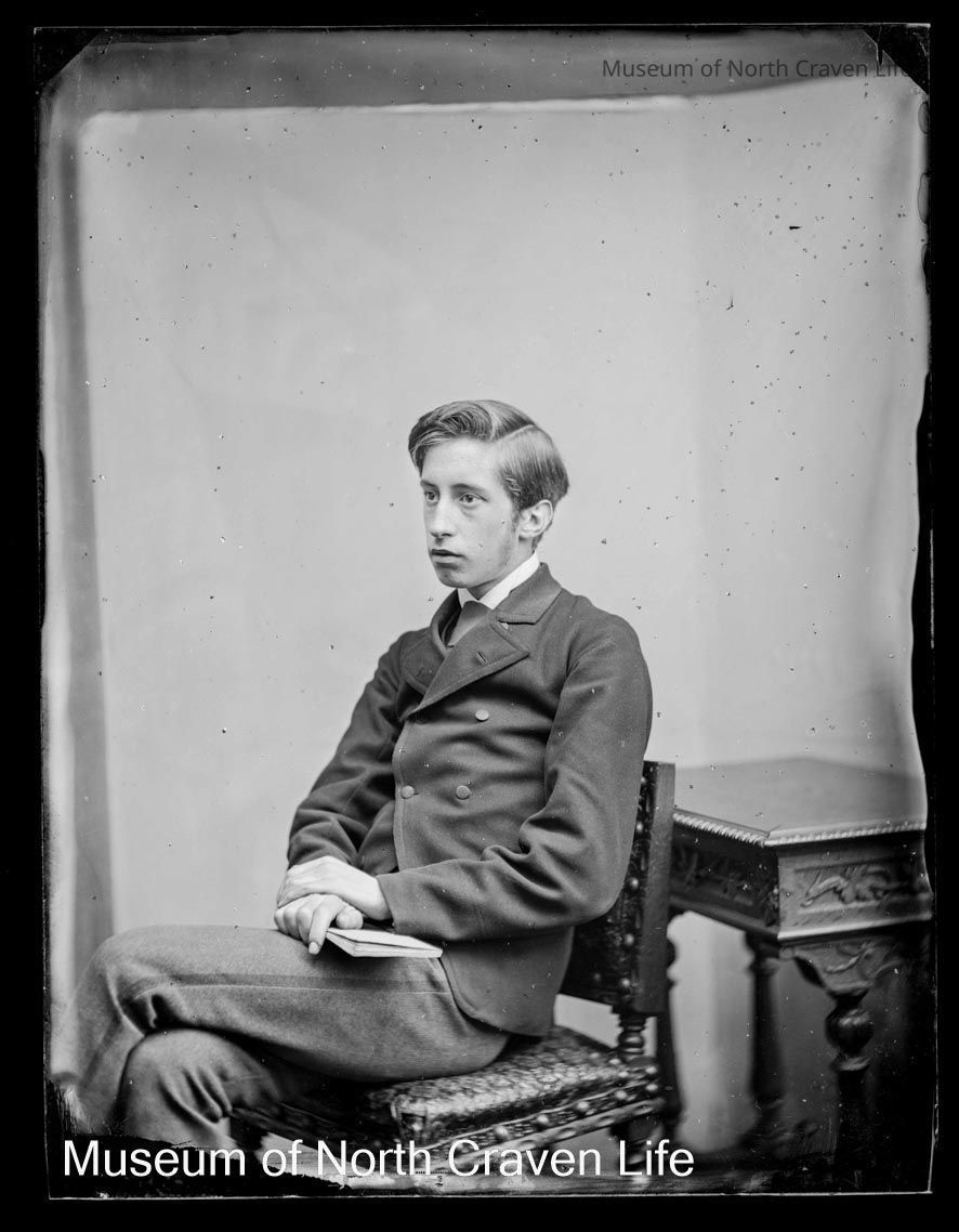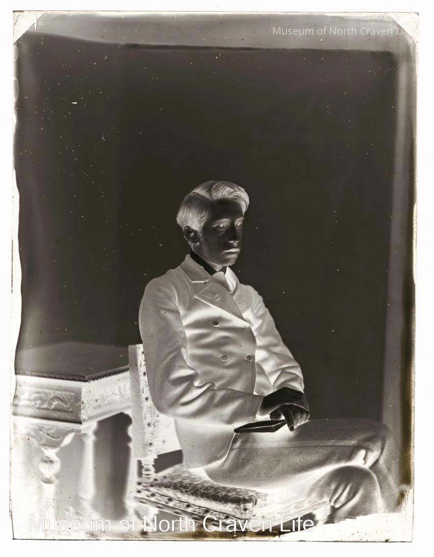 A quarter-plate wet collodion negative. A three-quarter length seated studio portrait of Mr. C. Geldard, Cappleside, 1873. He holds a slim book. He wears a double breasted buttoned jacket, trousers with a stripe, tie and white collar. There is a carved table behind him.Collection