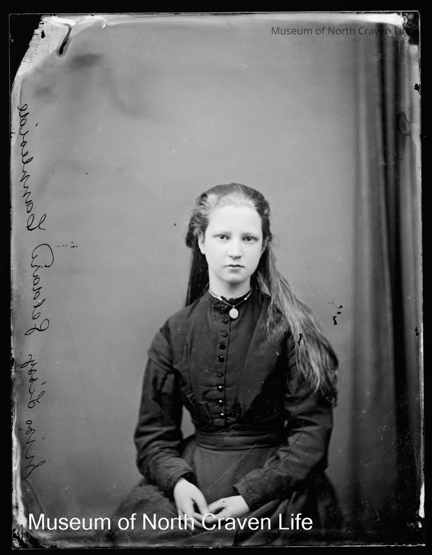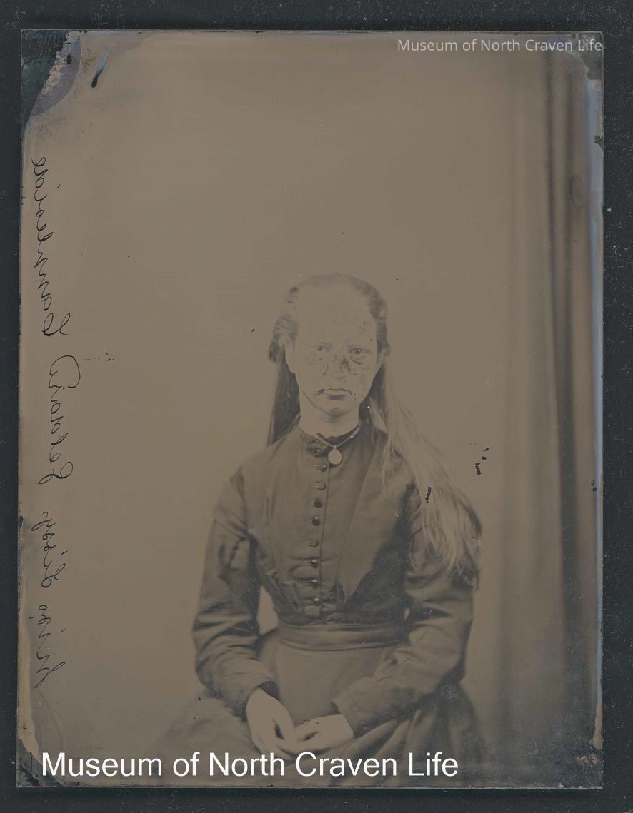 A quarter-plate wet collodion negative. A three-quarter length seated studio portrait of Miss Lizzy Geldard, Cappleside with clasped hands. She wears a dark dress with buttons down the centre of the top, and a locket.Collection