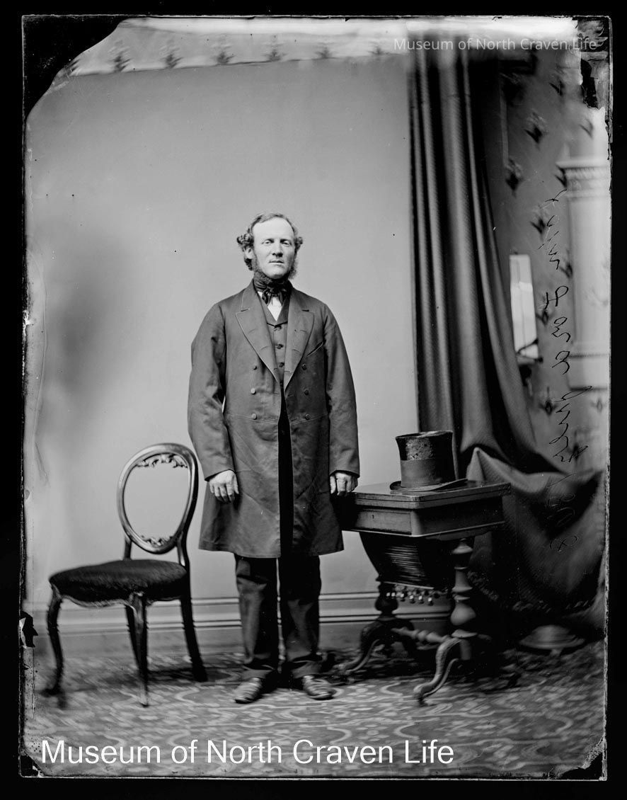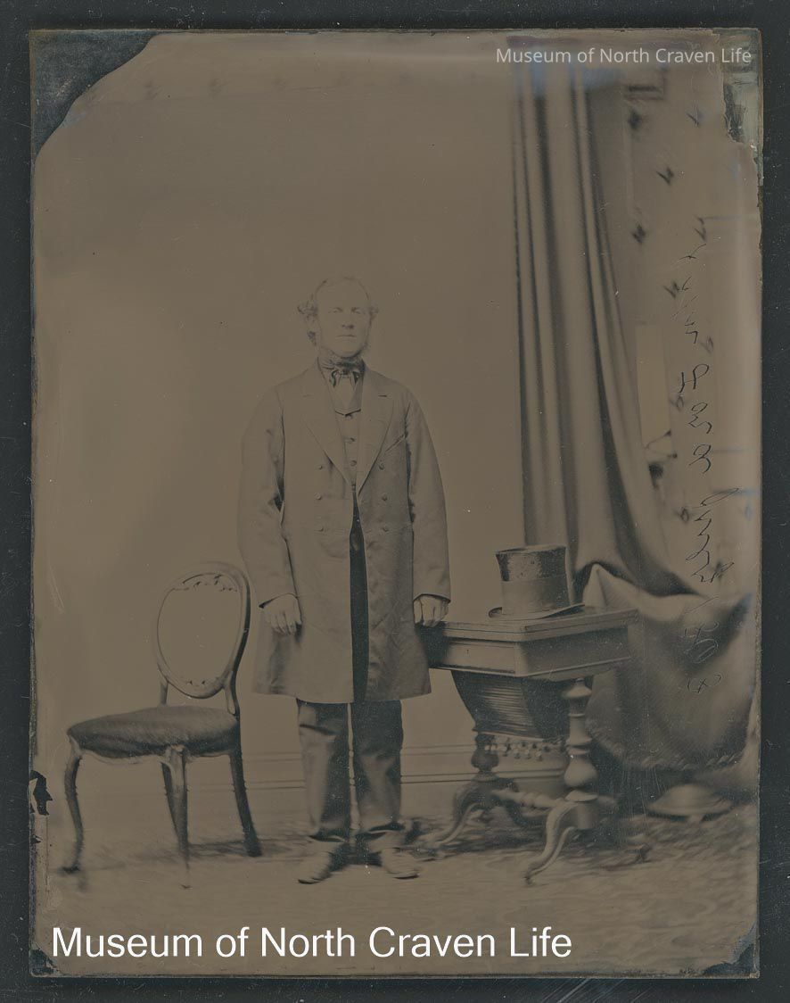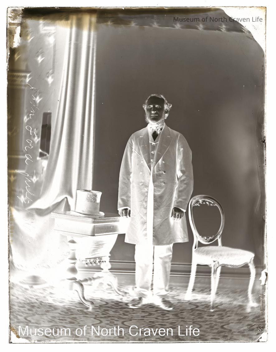 A quarter-plate wet collodion negative. A full length standing studio portrait of Mr John Lord, Upper Settle, 1868. He has a top hat on the table beside him. Dated 1868. He wears a long jacket, waistcoat and necktie. He stands between an open back chair and a table.Collection