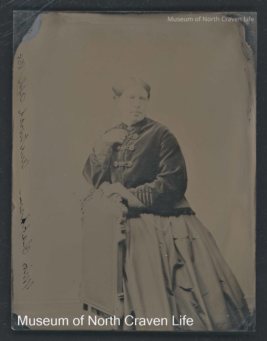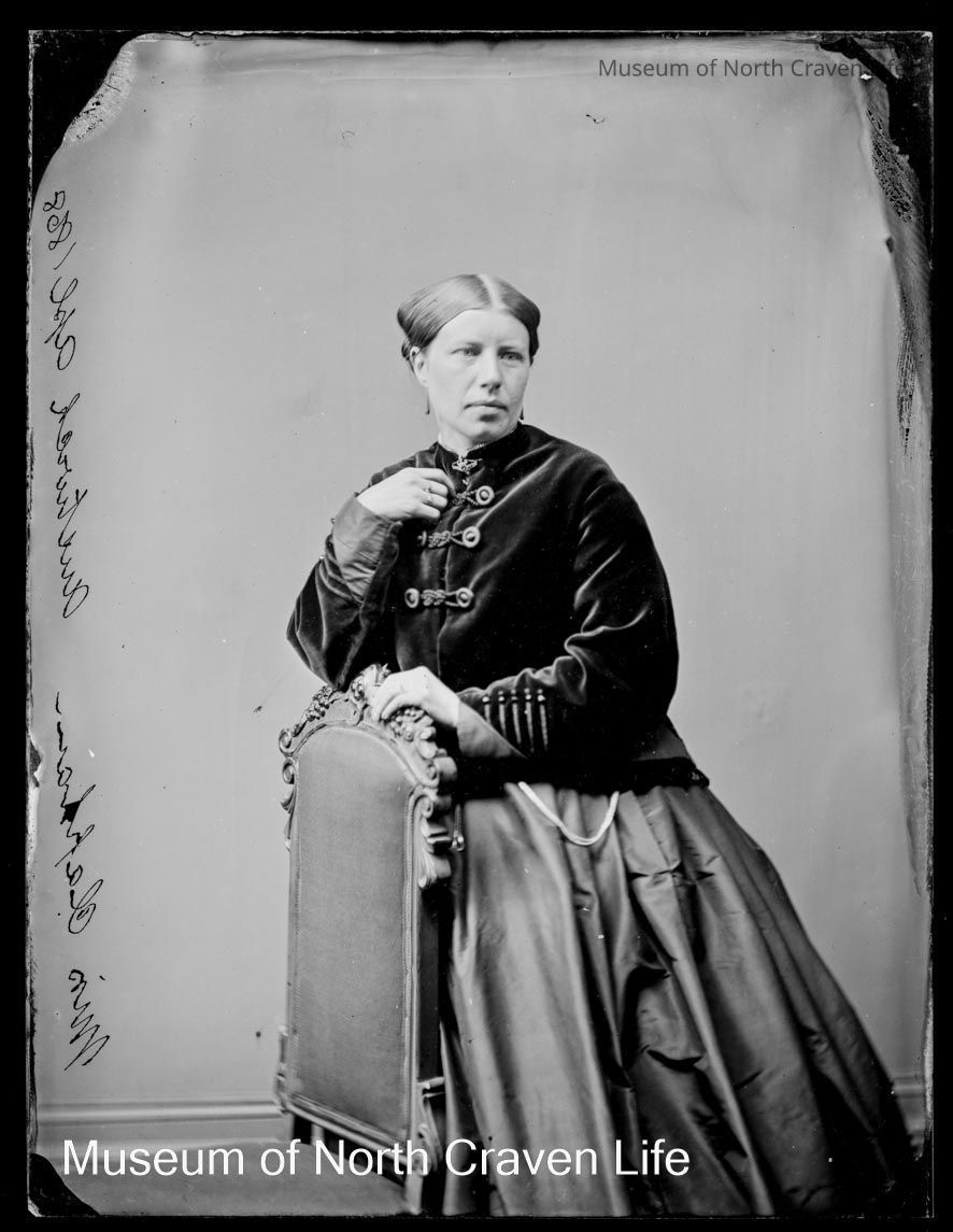 A quarter-plate wet collodion negative. A three-quarter length, standing studio portrait of Miss Clapham, Austwick, 1868, holding a high backed chair with one hand and the other hand at her neck. She wears a velvet jacket with double buttons and a voluminous skirt.Collection