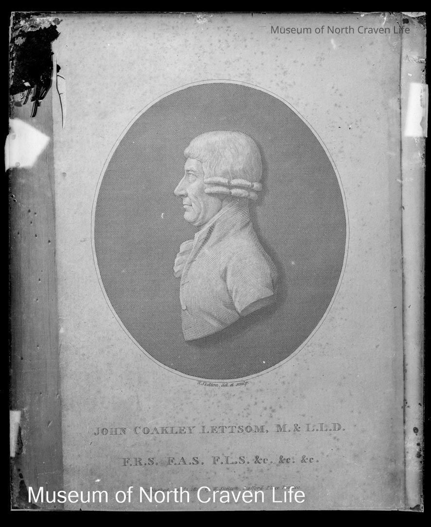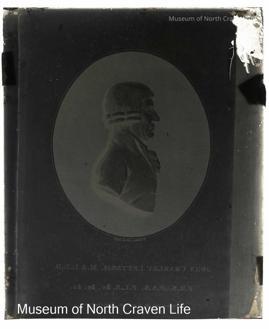 A quarter-plate gelatin silver glass negative. A photograph from a printed quarter-length silhouette of John Coakley Lettsom Oct 1866. It shows a drawing of a bust of Lettsom and underneath his full title, qualifications and memberships.Collection