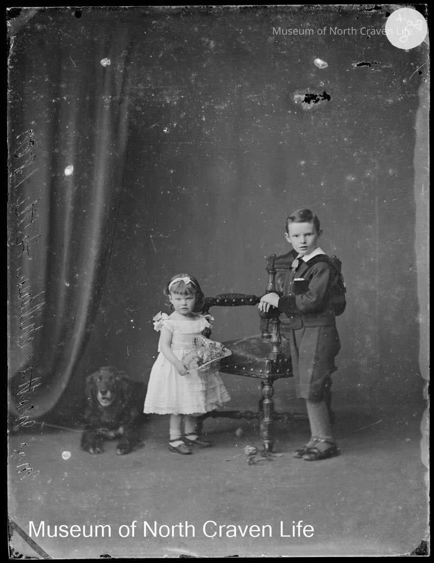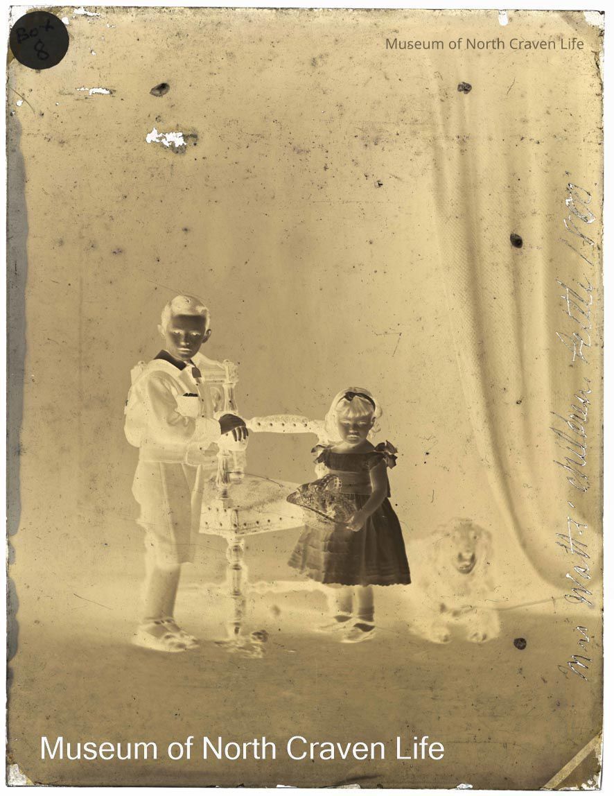 A quarter-plate glass negative (unknown process). A full length standing studio portrait of Mrs Watts' children, 1880. A boy stands to the left of a chair while a young girl stands on the right.Collection