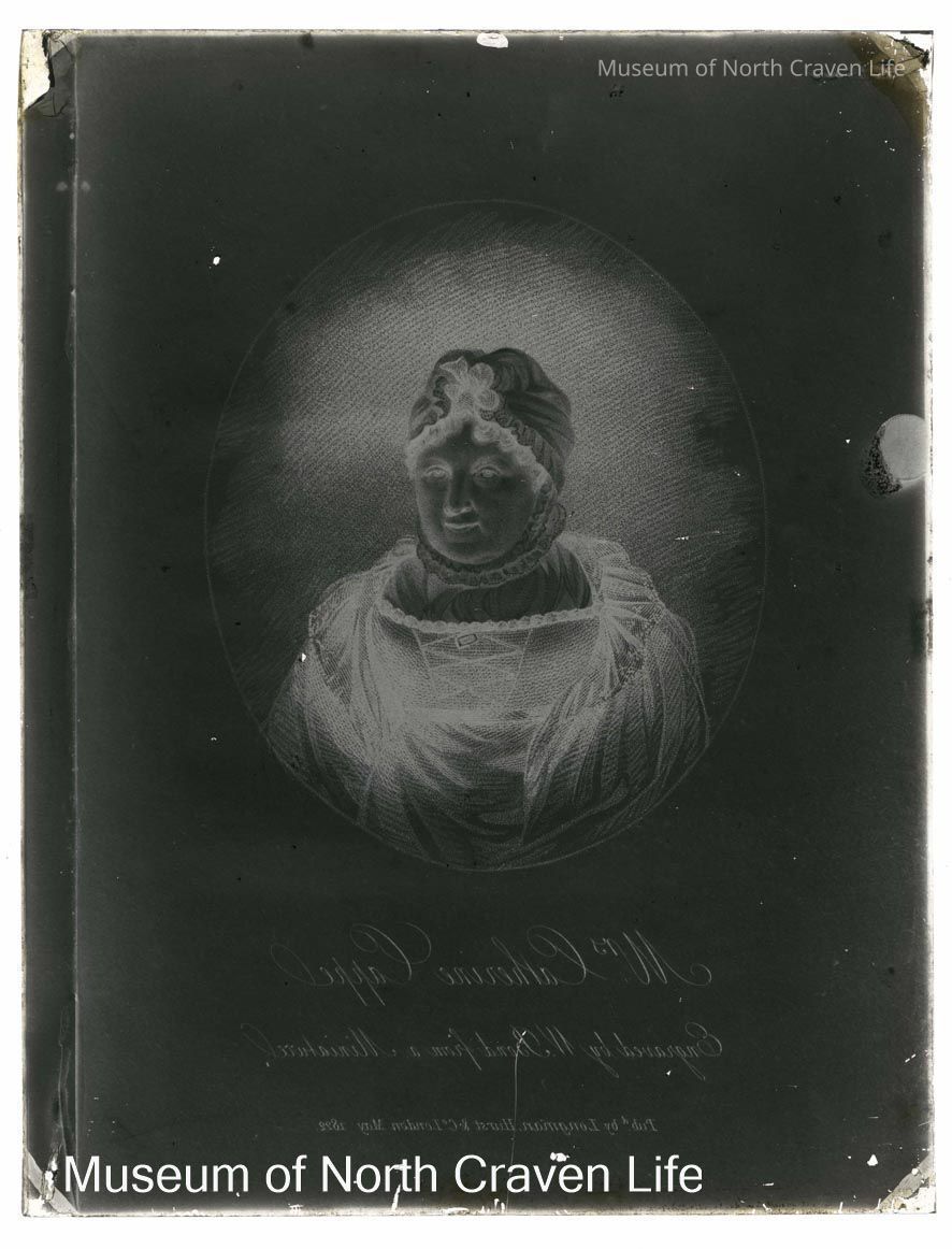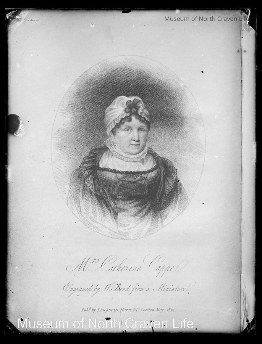 A quarter-plate gelatin silver glass negative. A photograph copy from a half-length portrait of Mrs Catherine Cappel, engraved from a minature by W. Bond. Text also shows 'Pub.d by Longman, Hurst & Co. London May 1822.' She wears a frilly lace bonnet and there is a lace around her neck. She wears a regency style dress and cape.Collection
