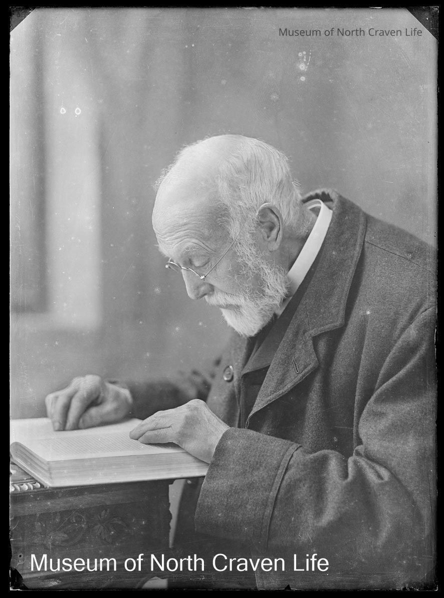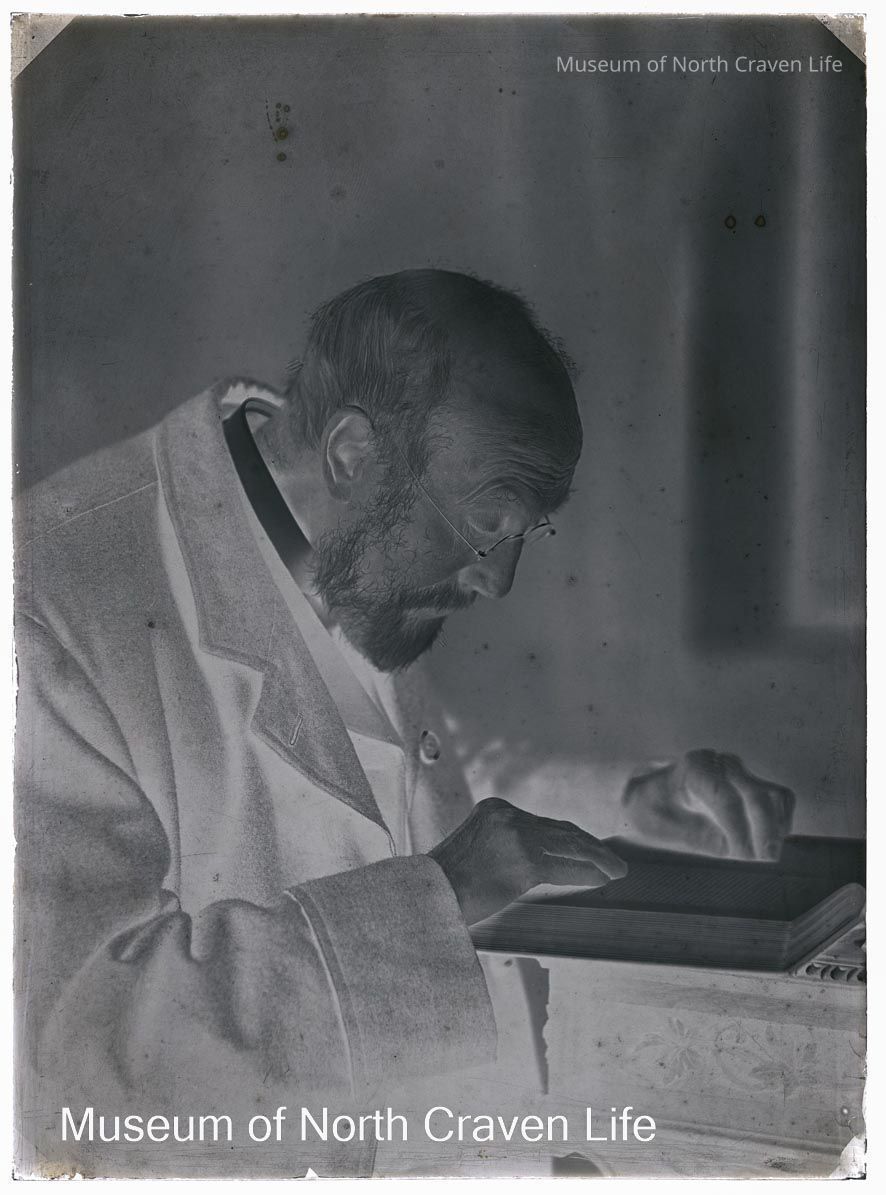 A half-plate gelatin silver glass negative. Portrait of an elderly bearded man (unidentified) wearing spectacles and reading a bookCollection