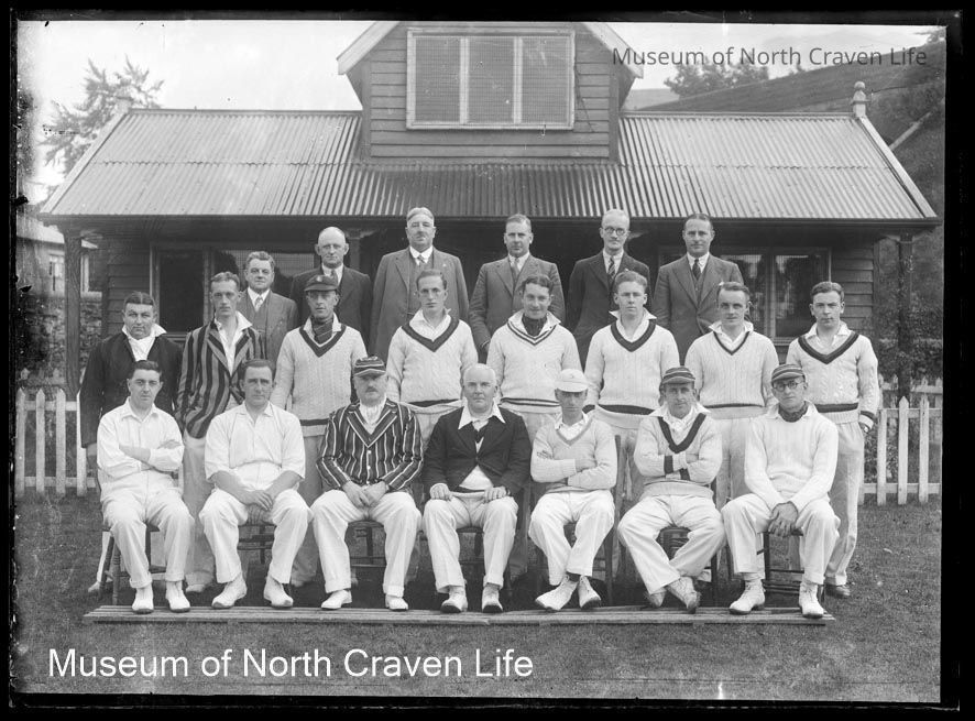 A half-plate gelatin silver glass negative. Portrait of Settle Cricket Group seated in front of a pavilionCollection
