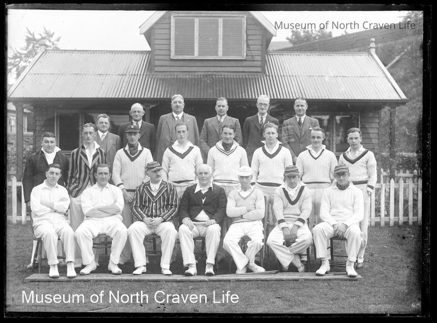 A half-plate gelatin silver glass negative. Portrait of Settle Cricket Group seated in front of a pavilionCollection