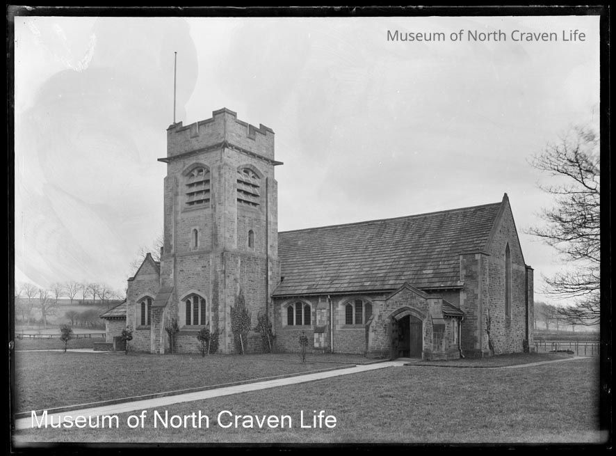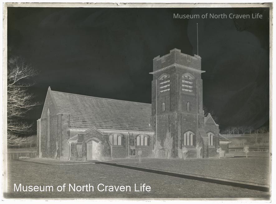 A half-plate gelatin silver glass negative. A view of St Aidan's Church, Hellifield, from the A65 across the front lawns. The church was built in 1906Collection