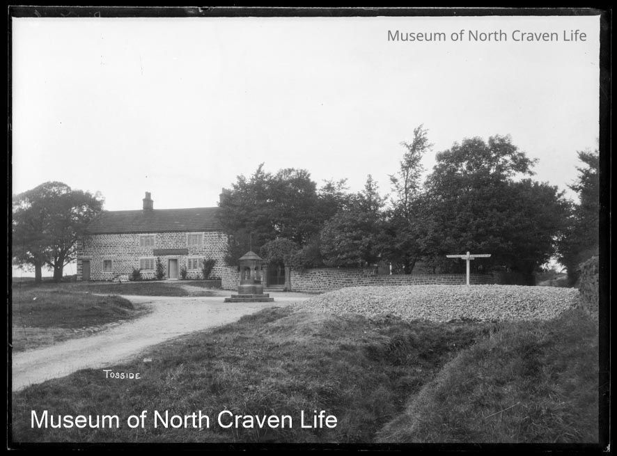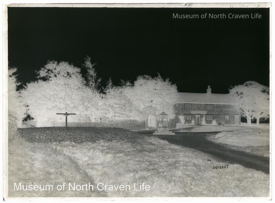 A half-plate gelatin silver glass negative. A view of a dwelling house in the village of Tosside. The water fountain stands in the centre ground with a signpost on the rightCollection