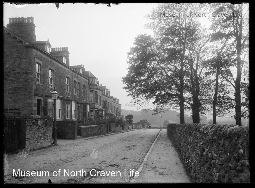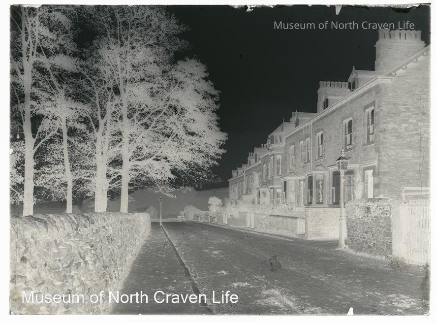 A half-plate gelatin silver glass negative. A view along Station road, Settle. Houses line the left side ; opposite stand a stone wall and a group of treesCollection