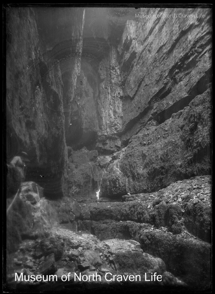 A half-plate gelatin silver glass negative. A view of a man pot holing. He stands in a ravine beneath a rock face on which a rope has been fixed. The man is pulling on the ropeCollection