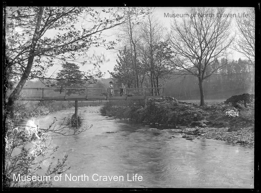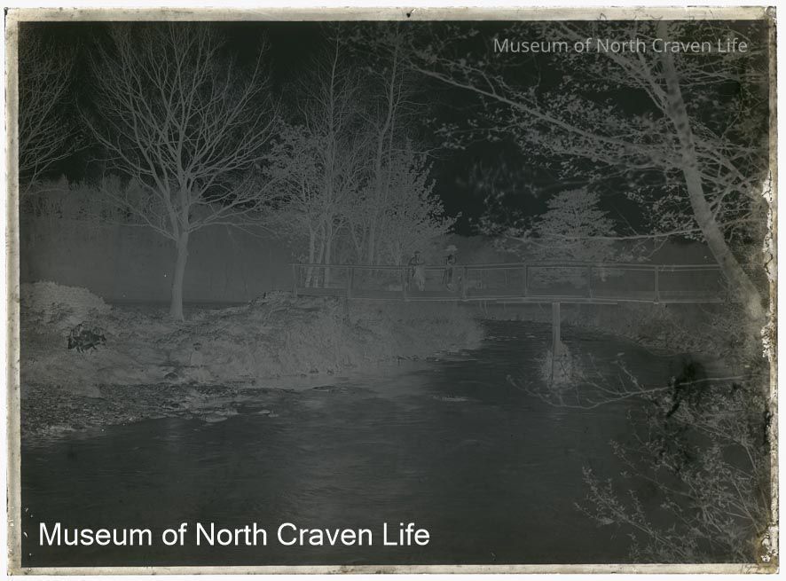A half-plate gelatin silver glass negative. A view of a footbridge over a river. Possibly at Clapham, Yorkshire. A man and woman with a dog stand on the bridgeCollection