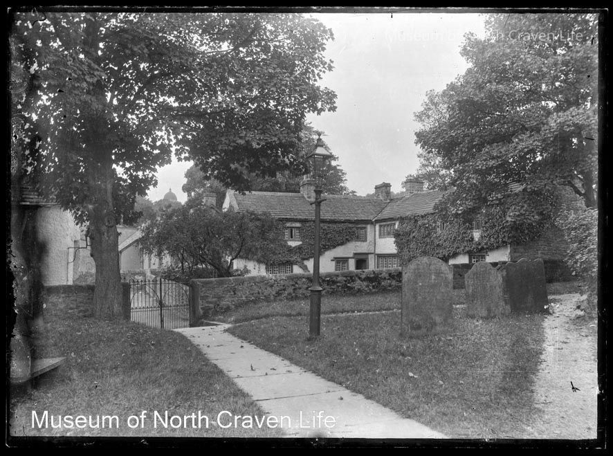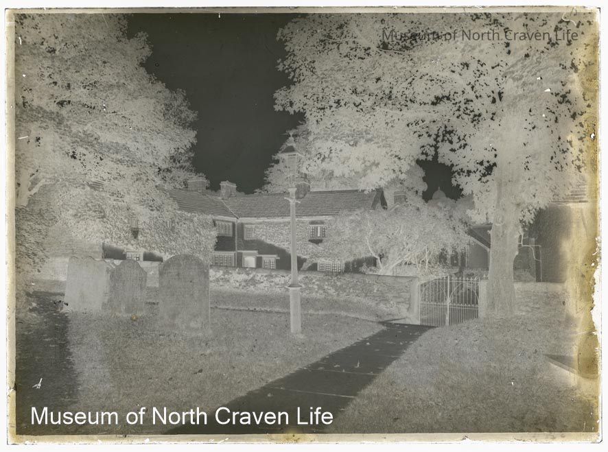 A half-plate gelatin silver glass negative. A view from St Alkelda's churchyard in Giggleswick towards a boundary wall with iron gates. Beyond in the background stands Ivy Fold cottages. Gravestones appear on the rightCollection