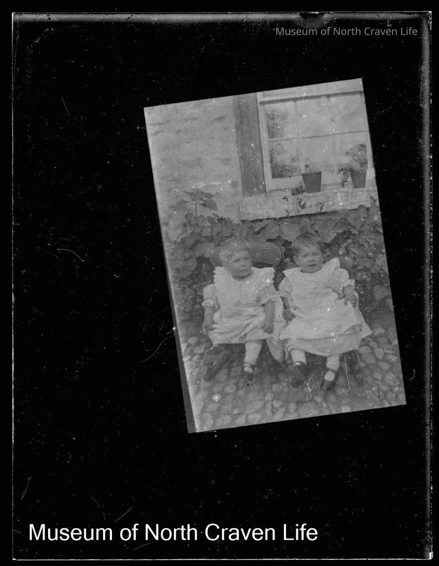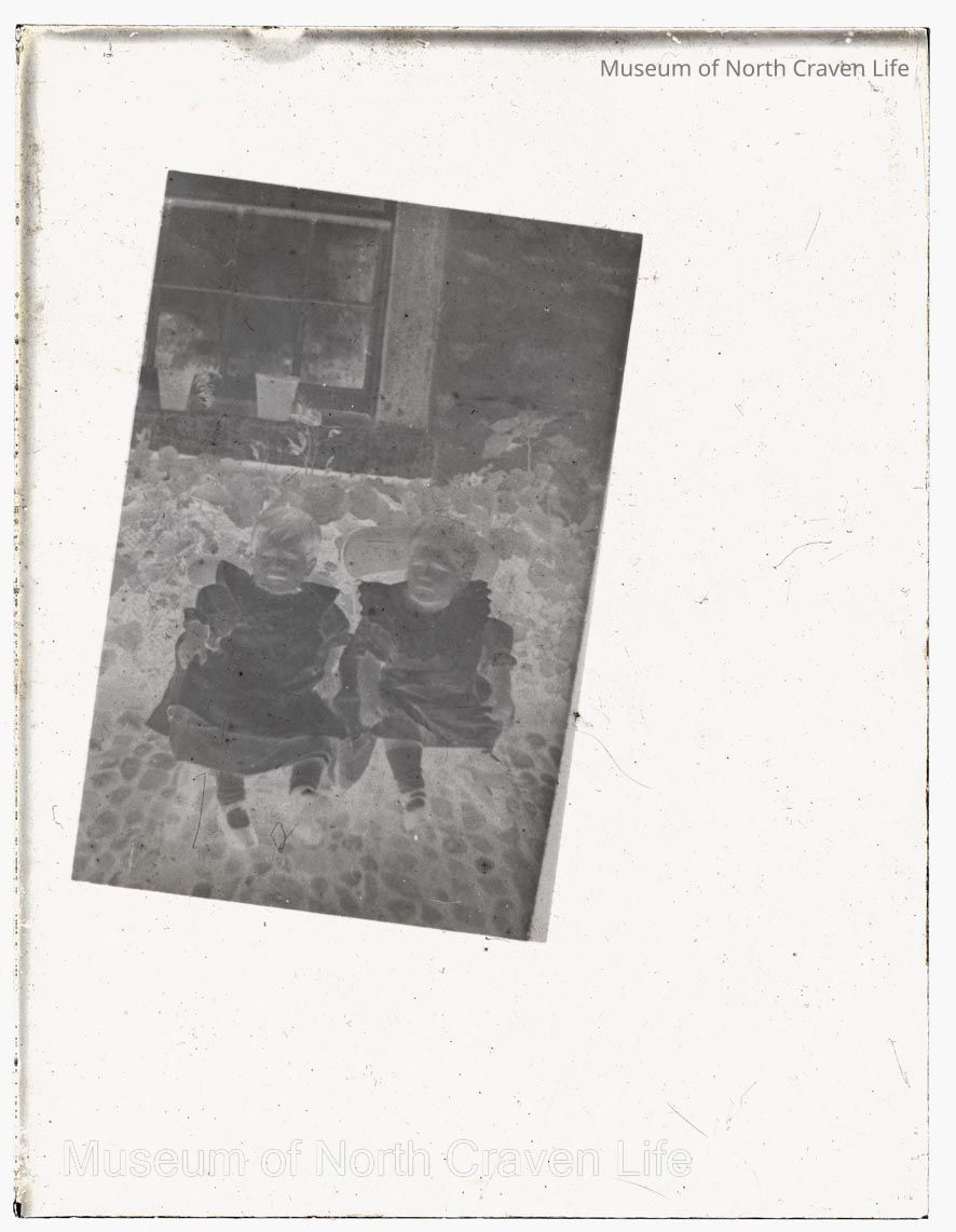 A quarter-plate gelatin silver glass negative. A photograph of two babies (twins) dressed identically, seated on cobbles outside a building and beneath a windowCollection