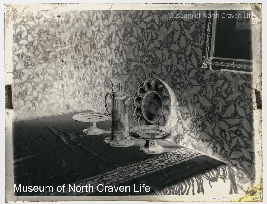 A quarter-plate gelatin silver glass negative. An image of a set of silver? tableware placed on a fringed tablecloth. Behind the table, the walls of the room are decorated with wallpaper and a paintingCollection