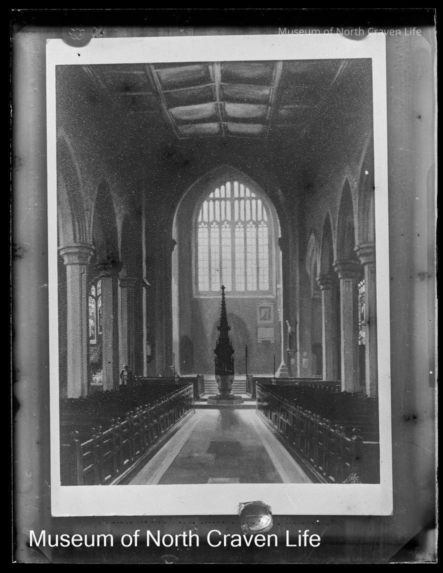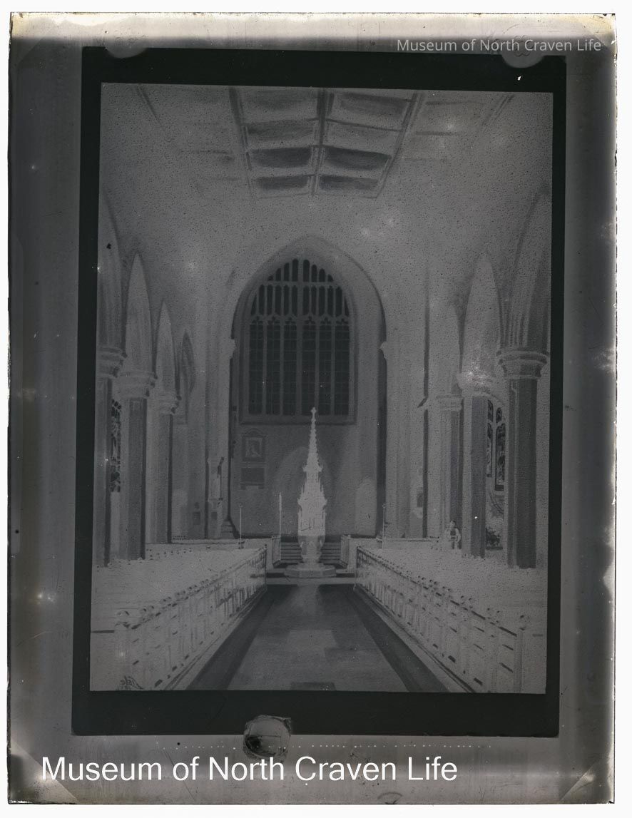 A quarter-plate gelatin silver glass negative. A view of the interior of a church looking towards a large window with six lights. Wooden pews line the aisle and a decorated structure, possibly a font, stands before the window.Collection