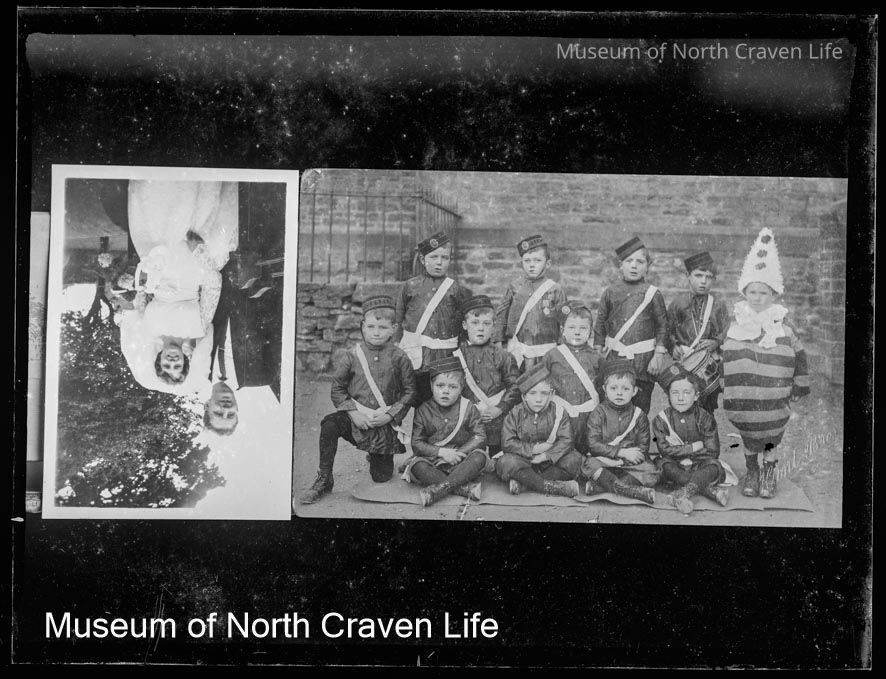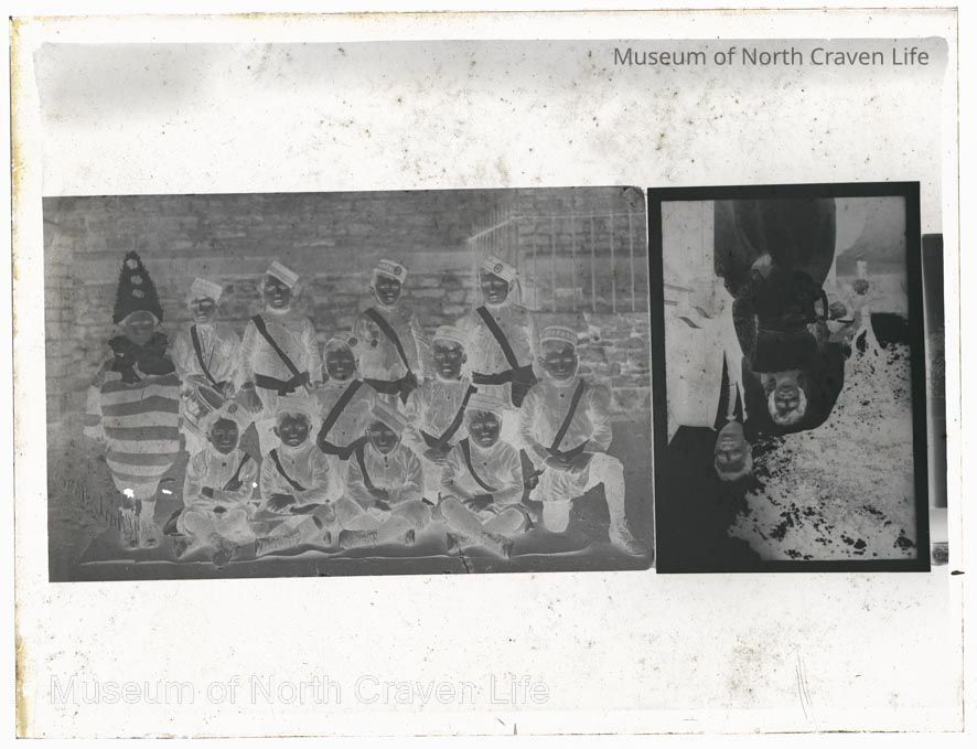 A quarter-plate gelatin silver glass negative. 2 images. 1 : a group of boys in uniform with one boy dressed in a clown costume (Settle Boys Brigade). 2 : a man in a suit with a woman in bridal dressCollection