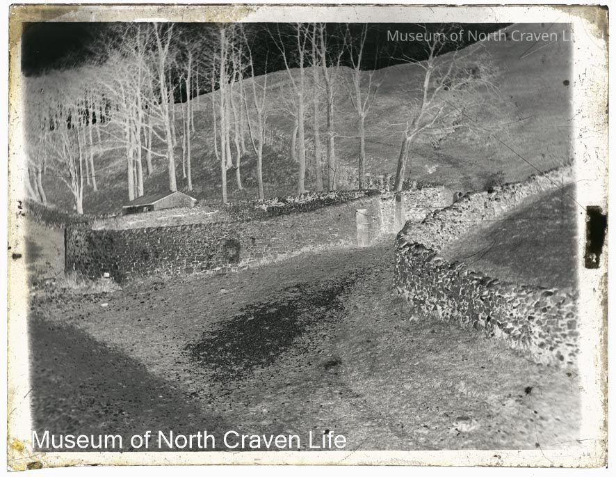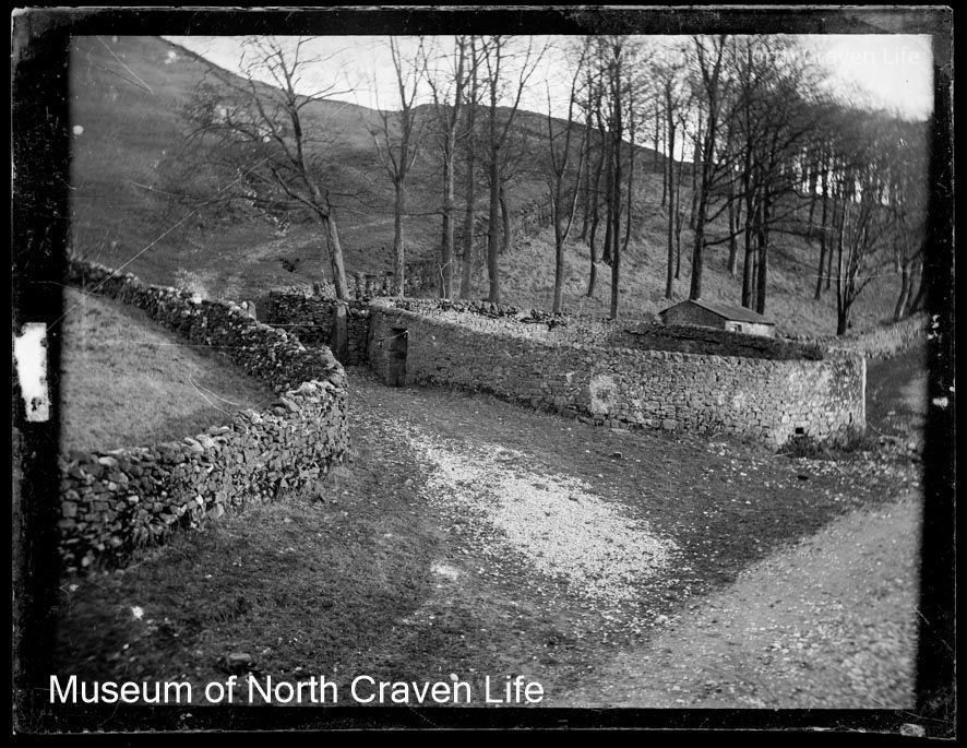 A quarter-plate gelatin silver glass negative. A view of a lane passing between two stone walls and rising up past a stand of trees. The circular walled enclosure to the right of the lane is the former animal pound for strays.Collection
