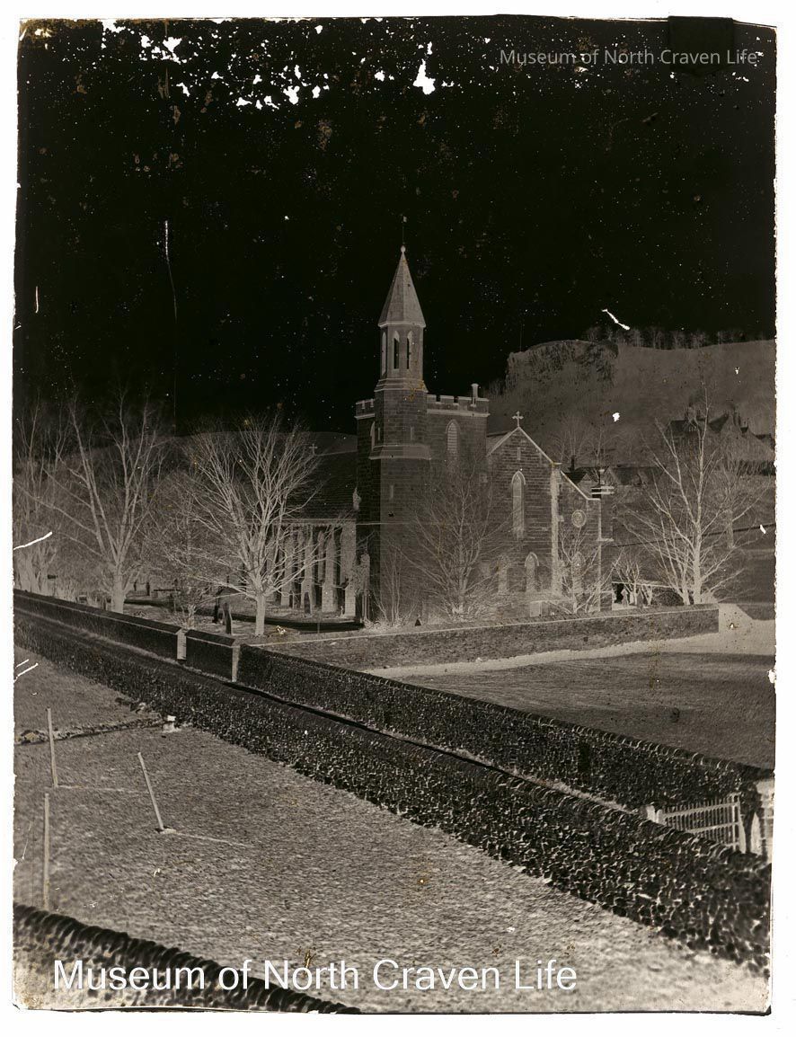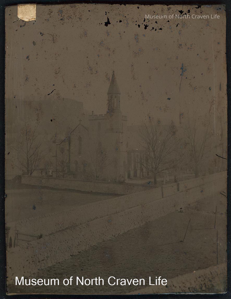 A quarter-plate wet collodion glass negative. A view across fields and stone walls to the Church of Holy Ascension in SettleCollection